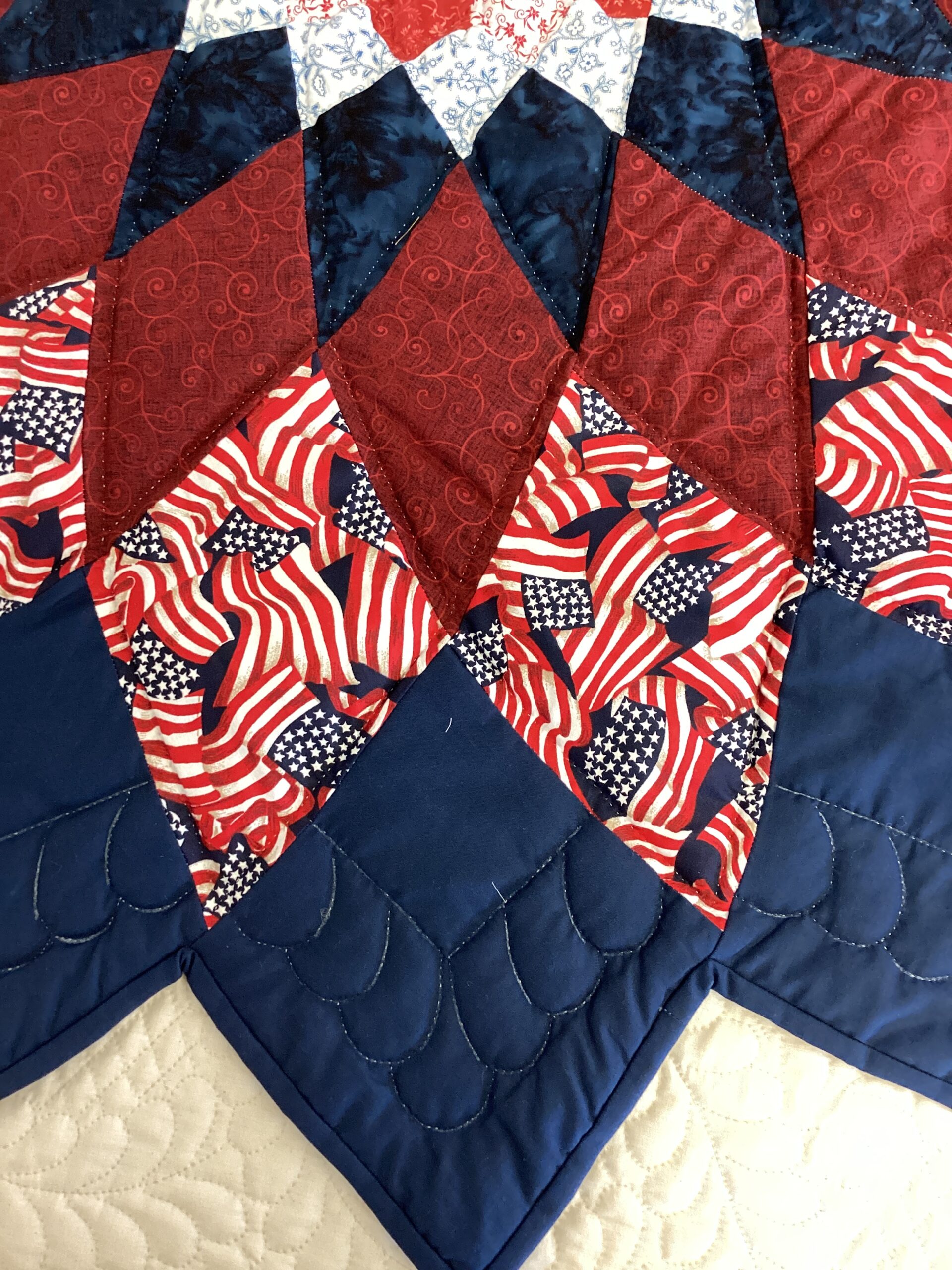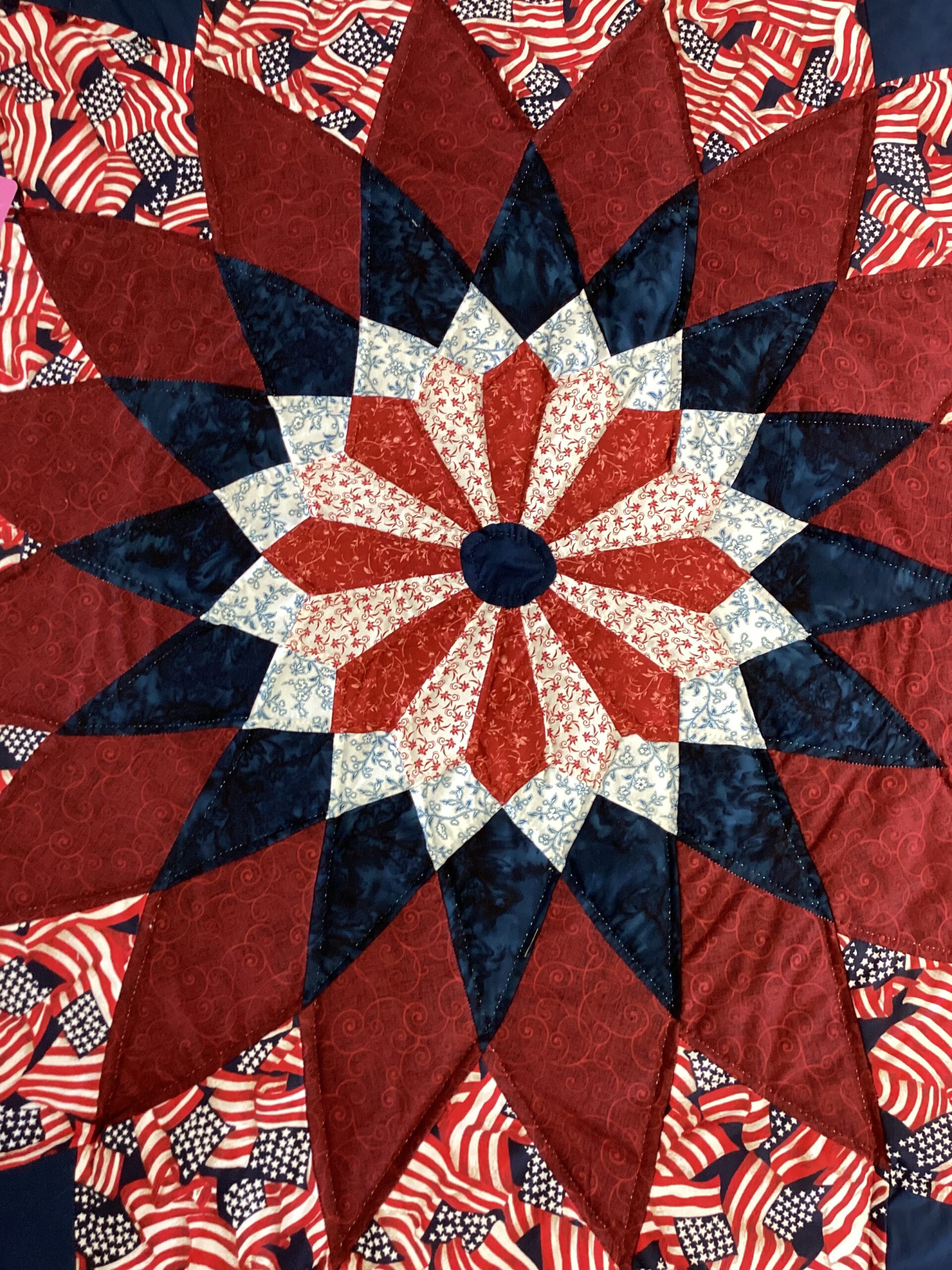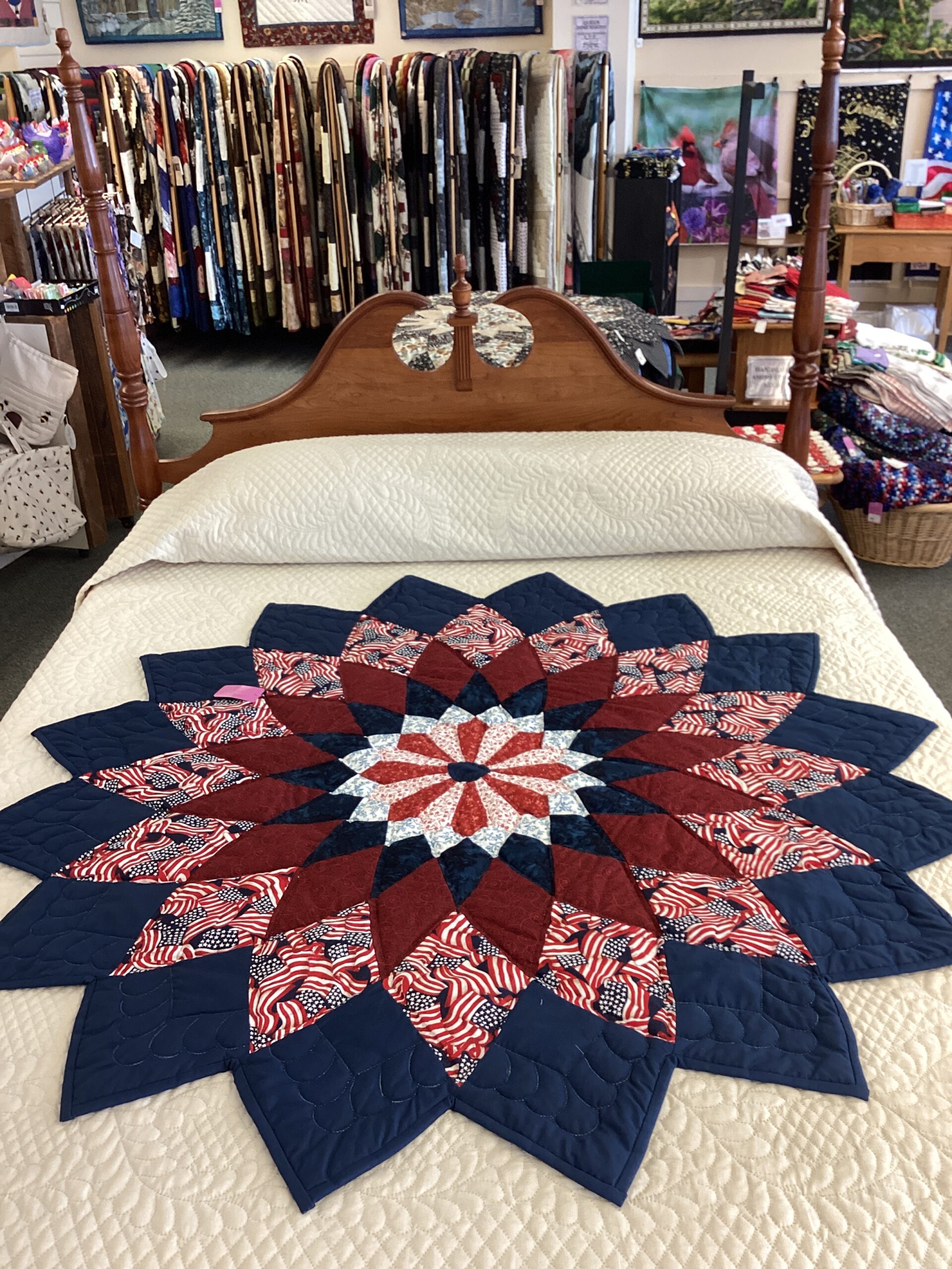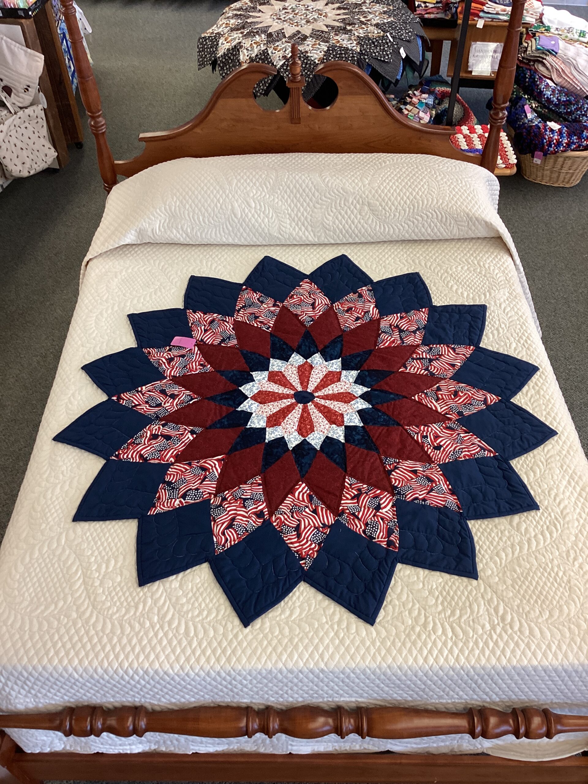 The traditional Dahlia pattern is used as a cut out to use as a bed topper creatively done with americana fabric.