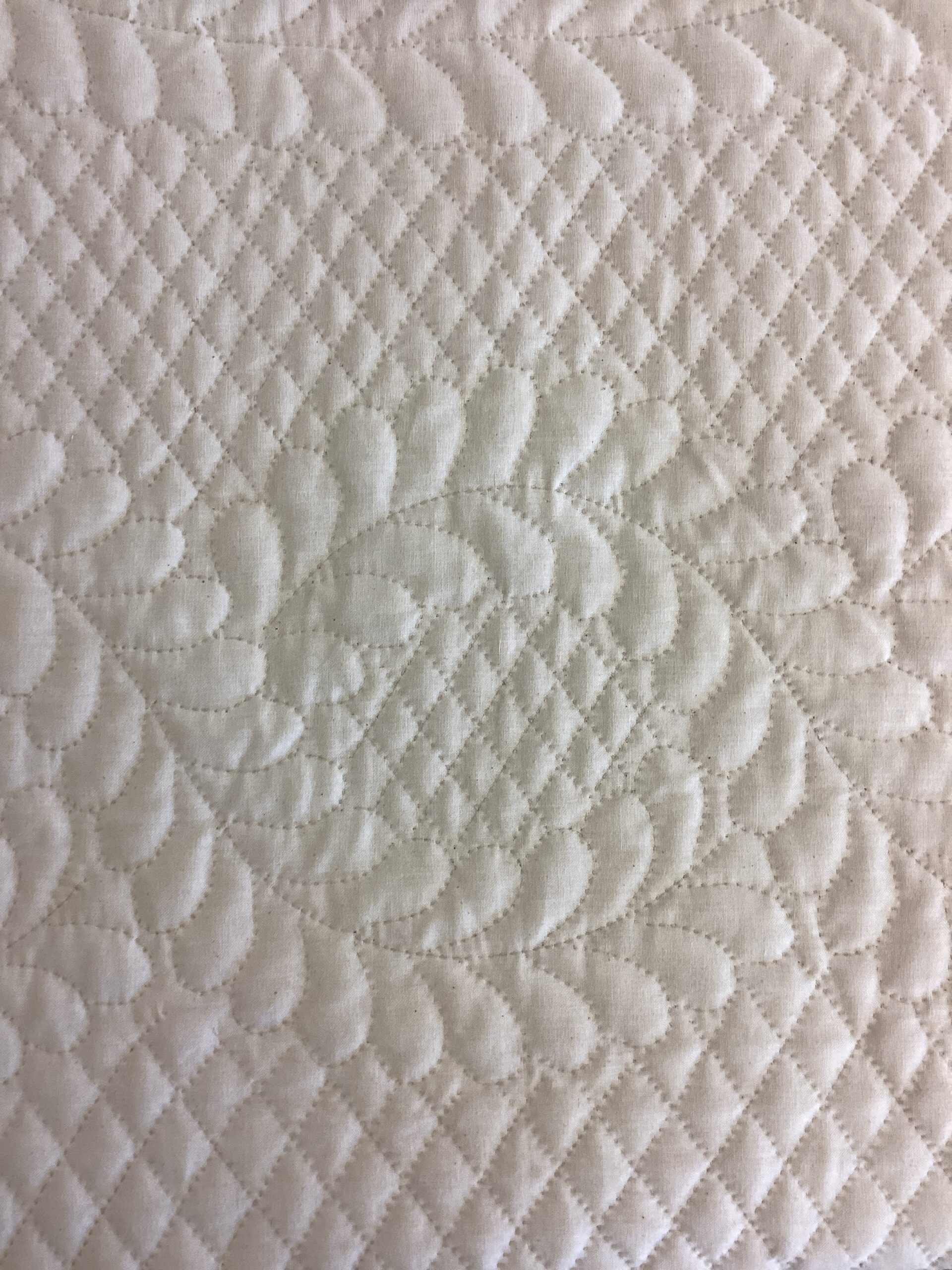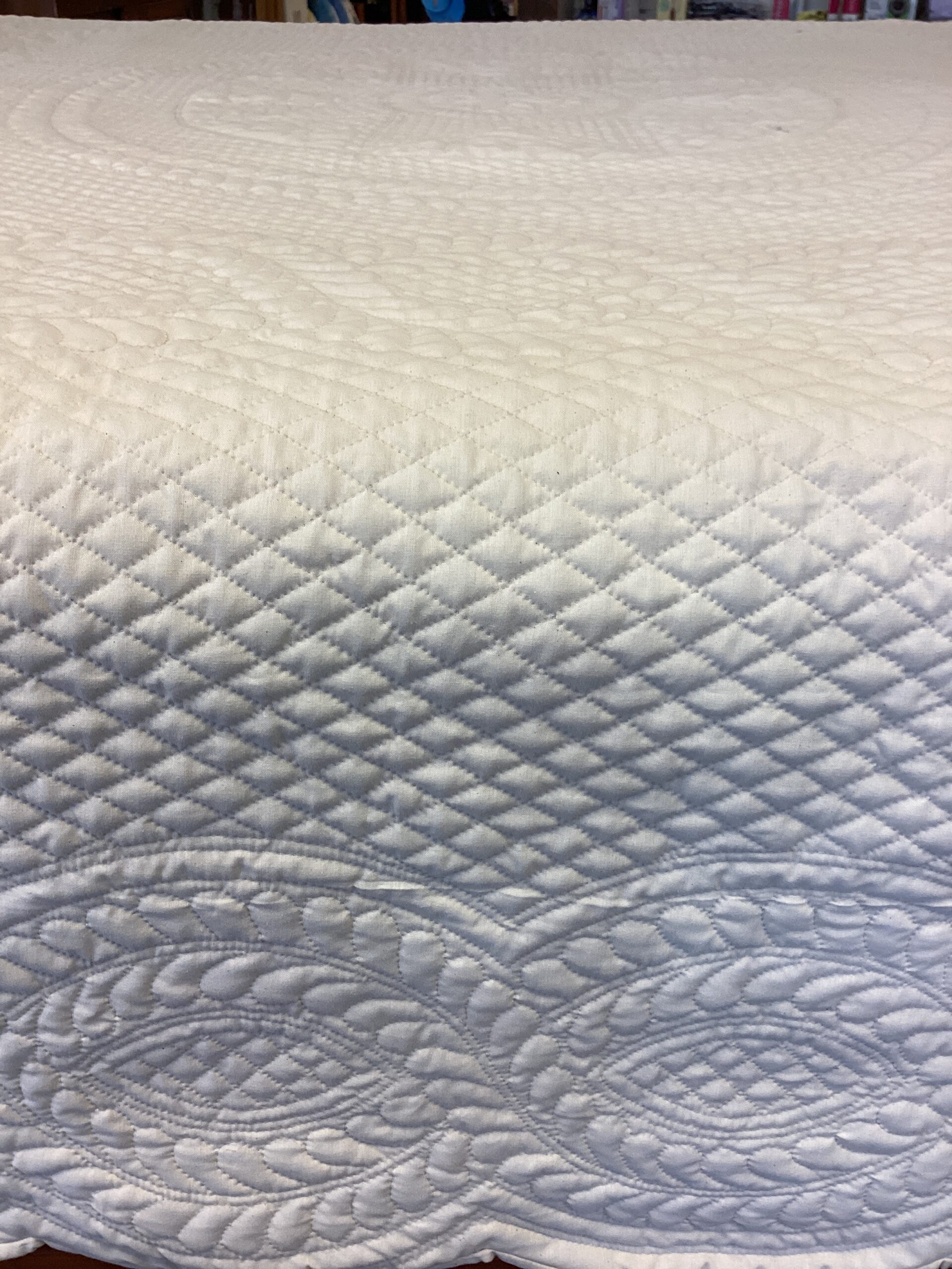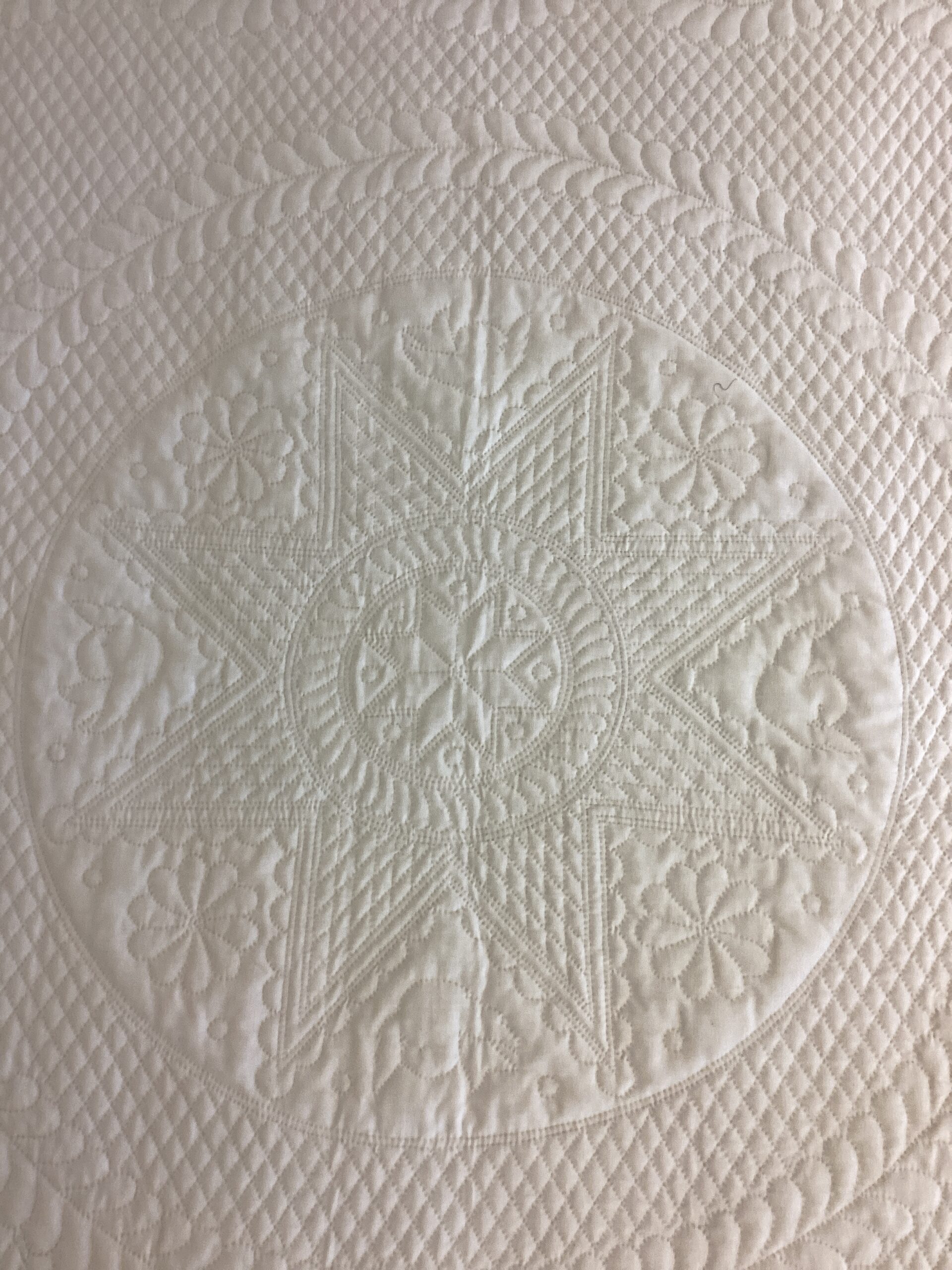 The story is that Milton Hershey’s wife saw this particular design on a side of a building. She adored it very much. Her husband commissioned a quilter to stitch the image into an Heirloom/wholecloth quilt.