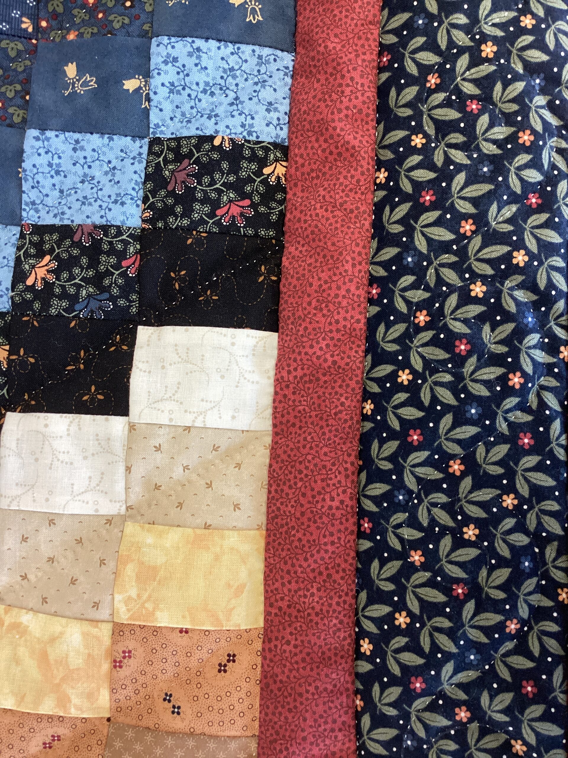 A beautiful Bargello made with shades of blue from light to dark. Burgundy red to a rose shade which are contrasted with cream to beigey-yellows and taupe. The border is a navy blue with small floral print and leaves of 3 .The back is signed by the artist and the fabric backing is a cream with taupe colored design every so slightly