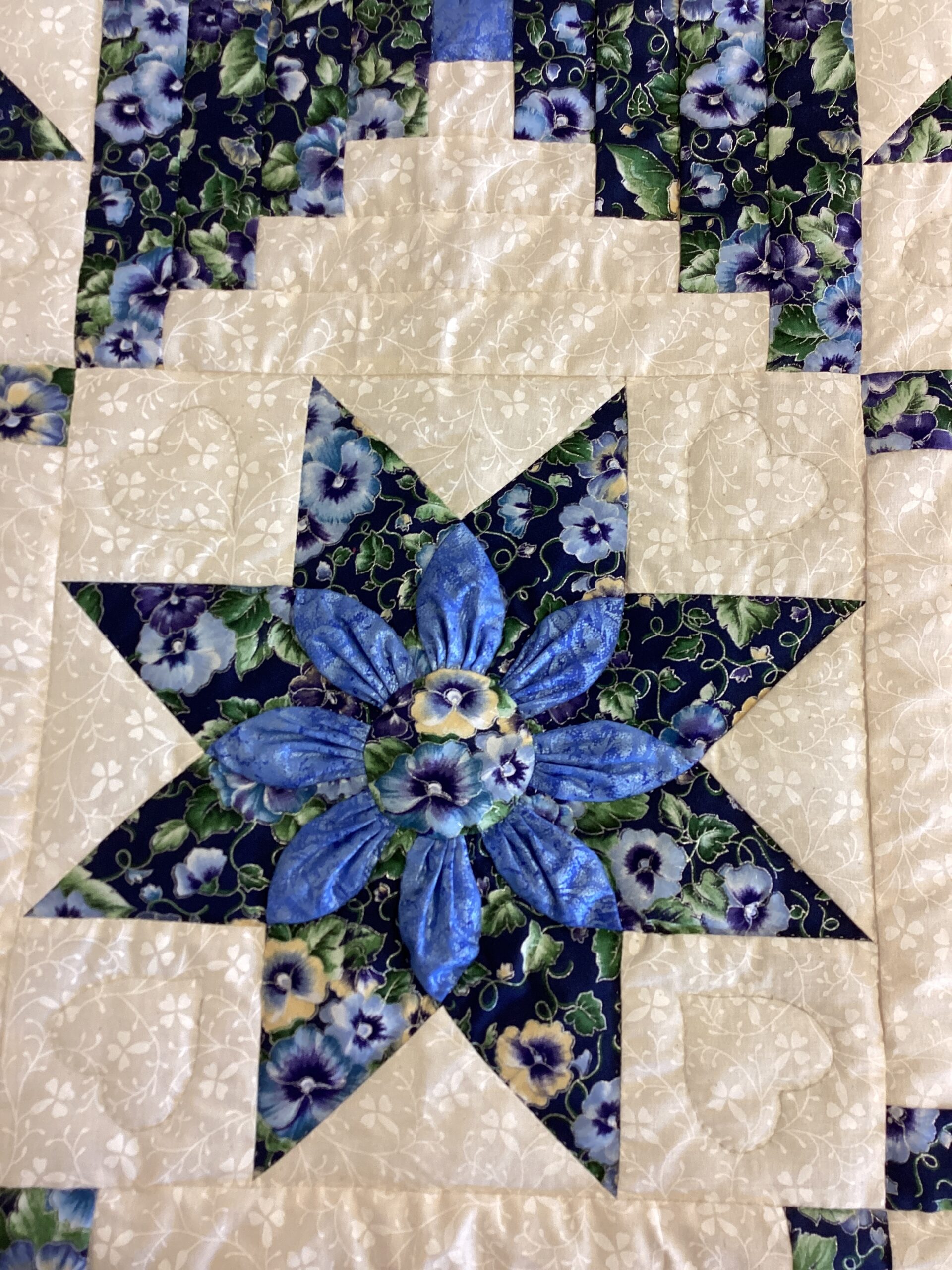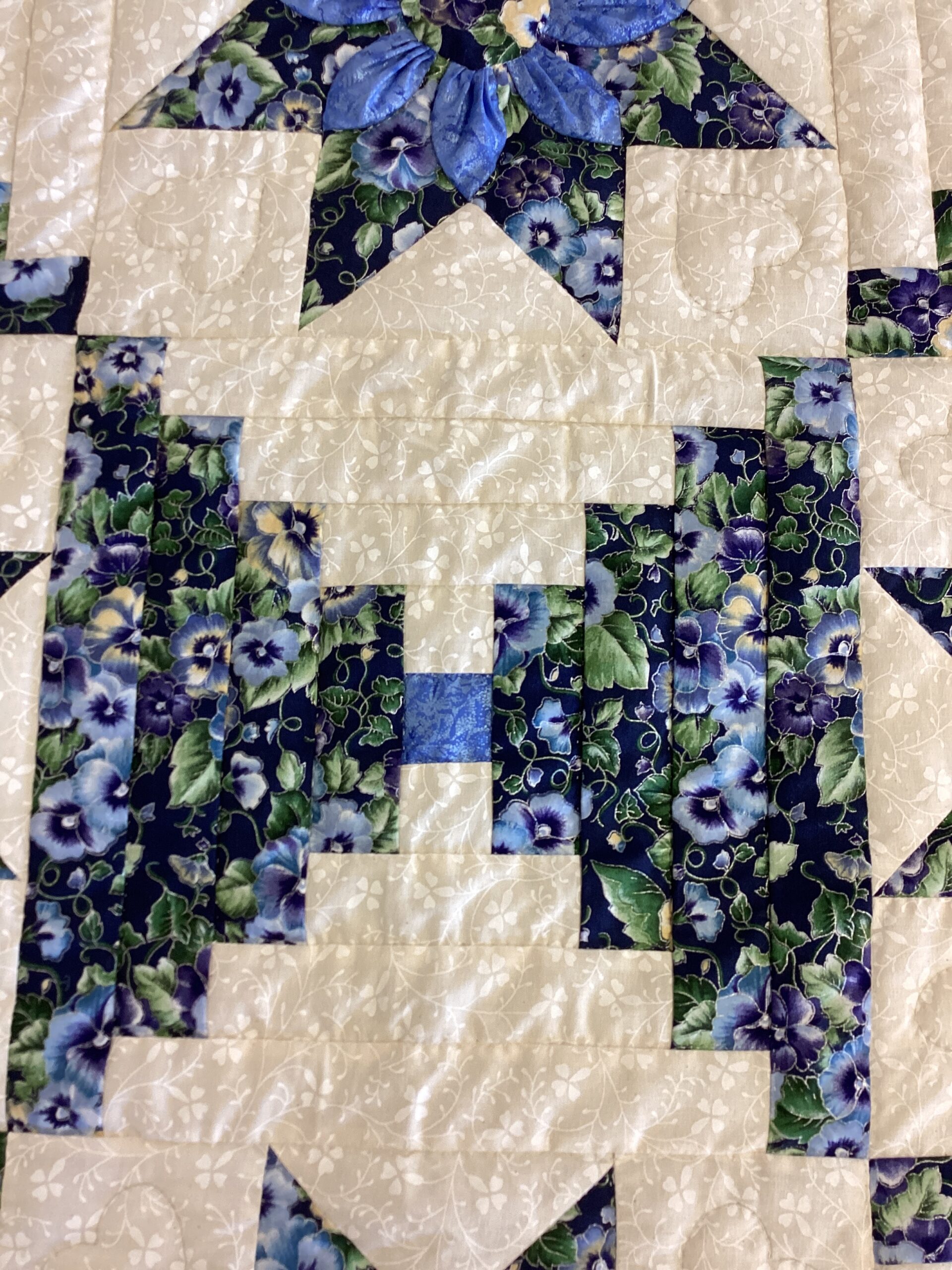 A traditional pattern with a dahlia and log cabin combined . Blue pansy fabric on a creamy white background makes these colors pop! and say WOW!