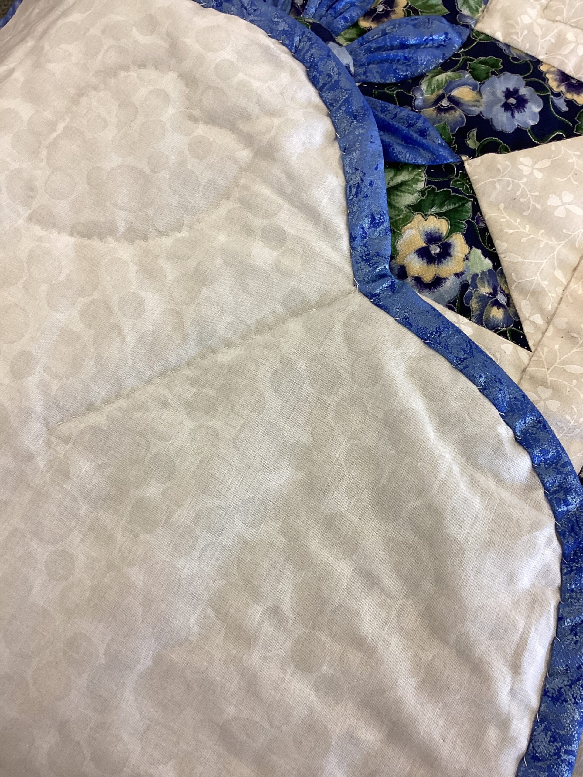A twist on the traditional Log Cabin pattern by using light and dark fabrics to create the image of a dahlia thru out the quilt. Fabrics used are a blue pansy print on an off white background. The backing is an off white with a circle pattern ever so lightly shown .