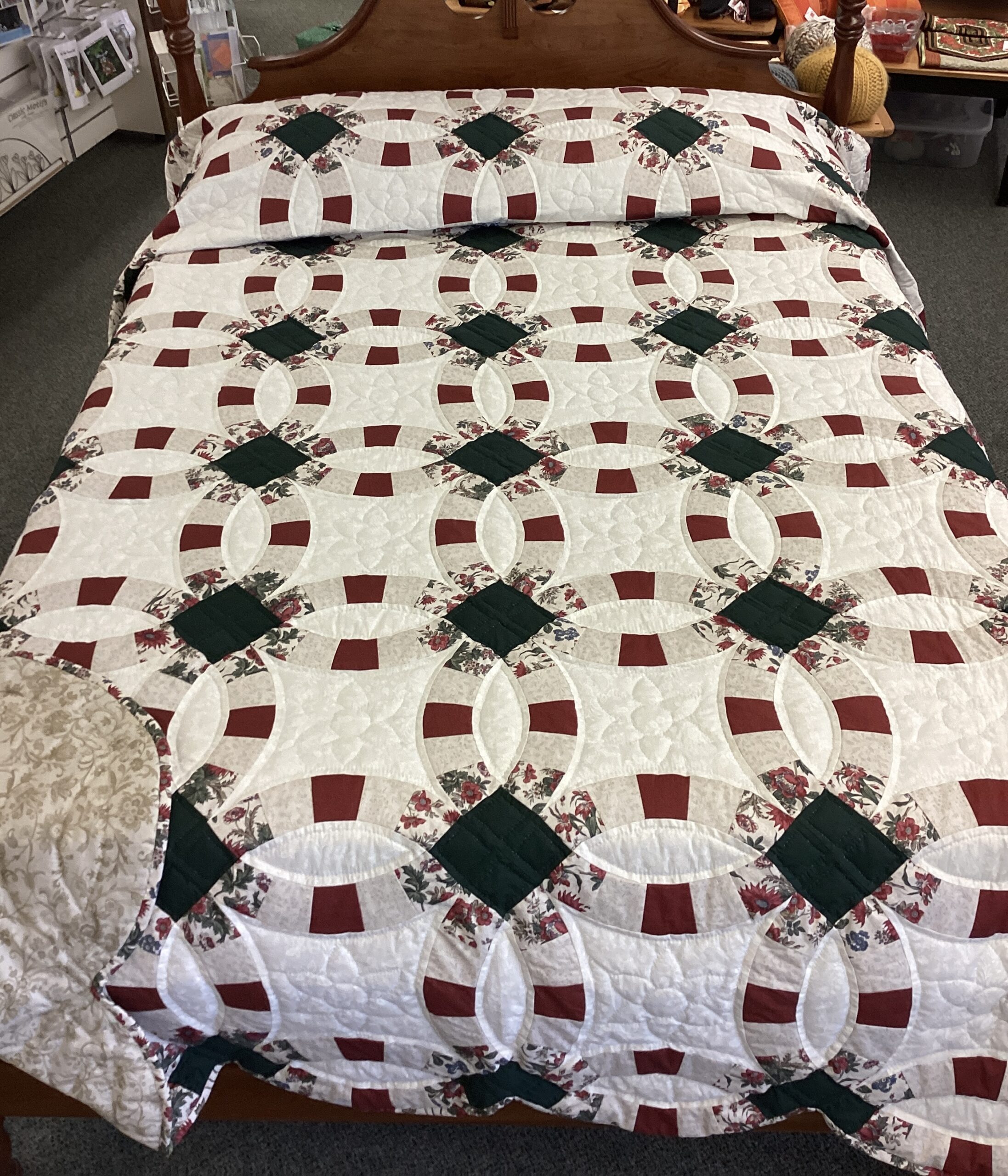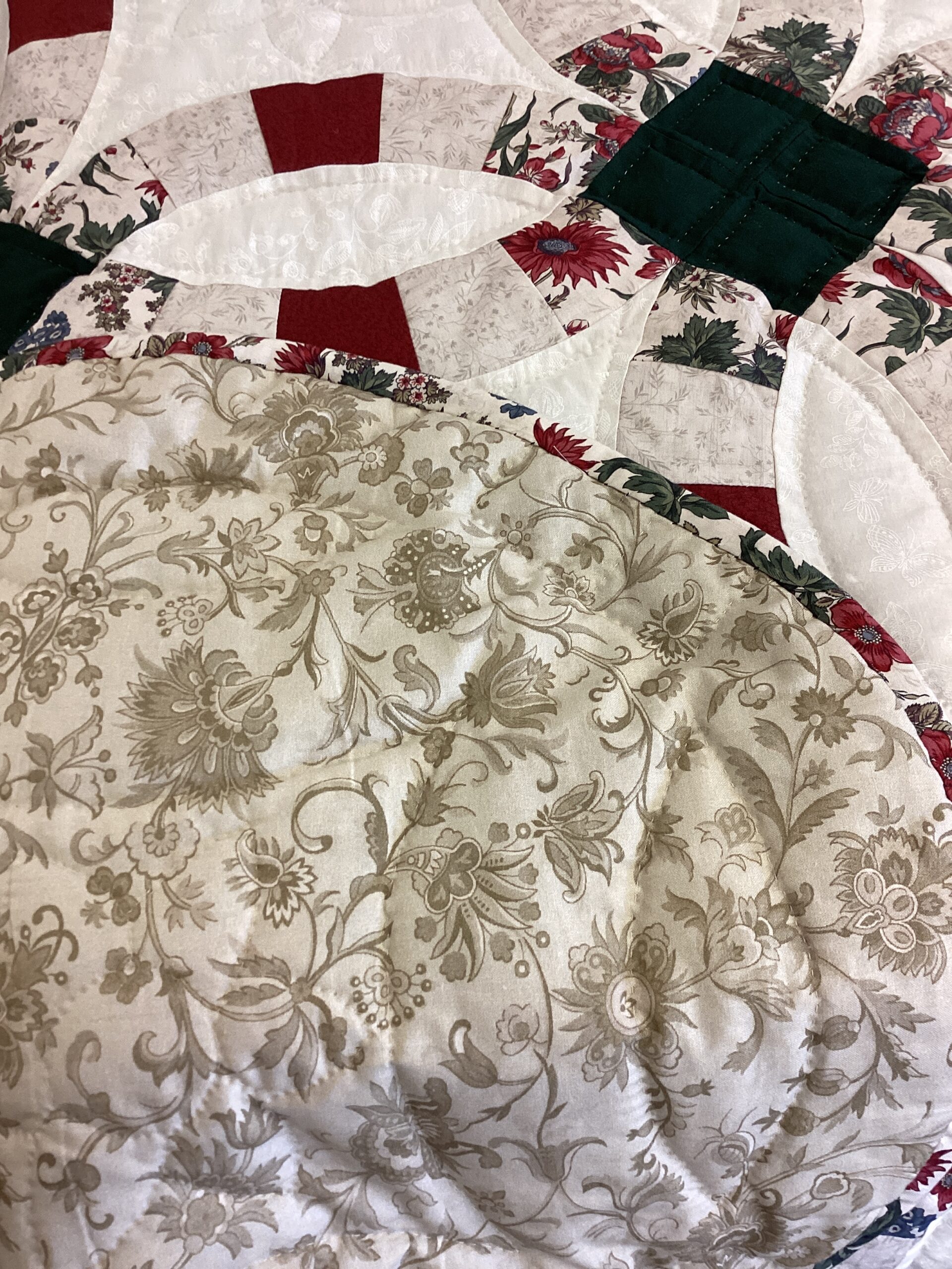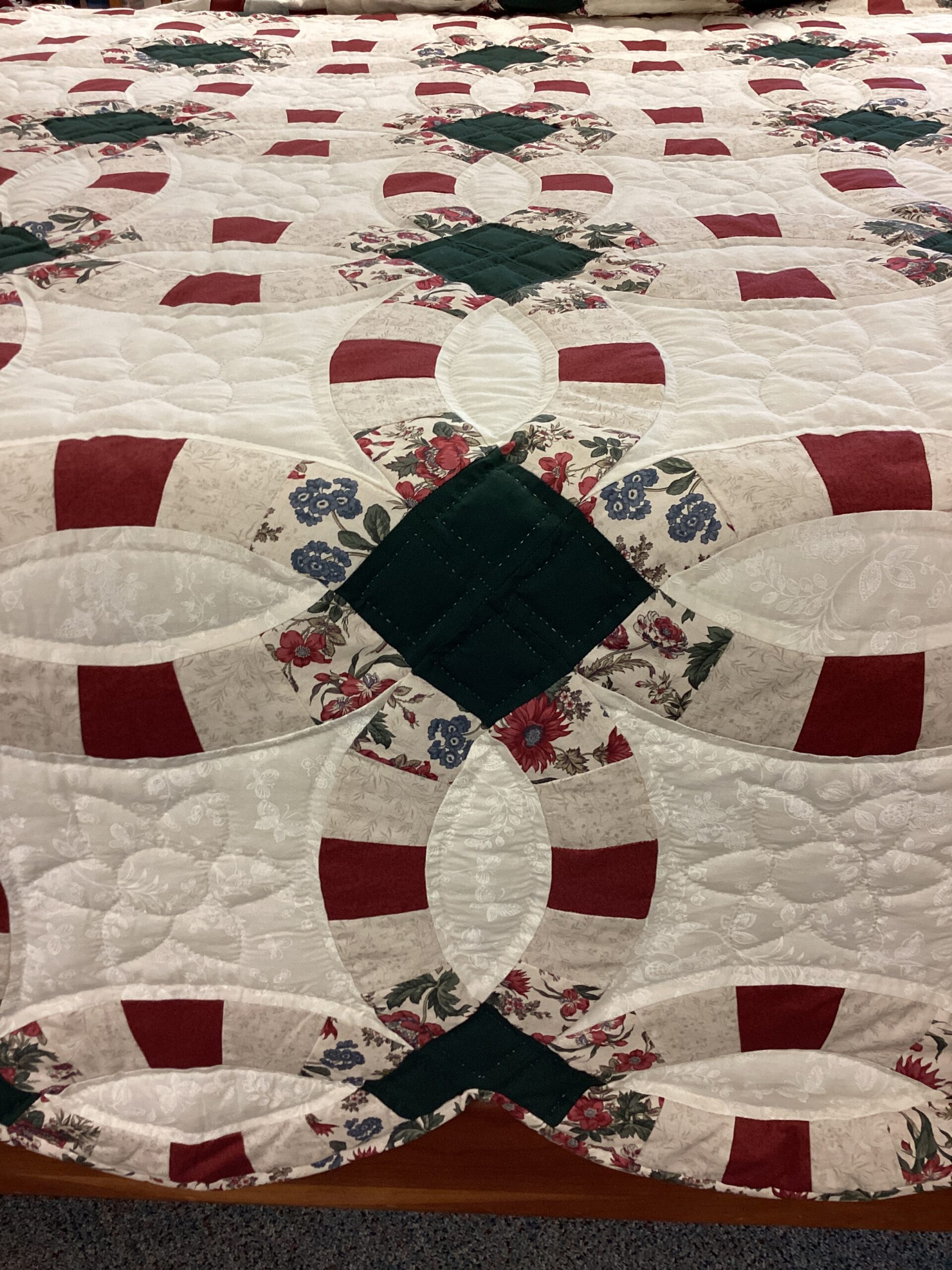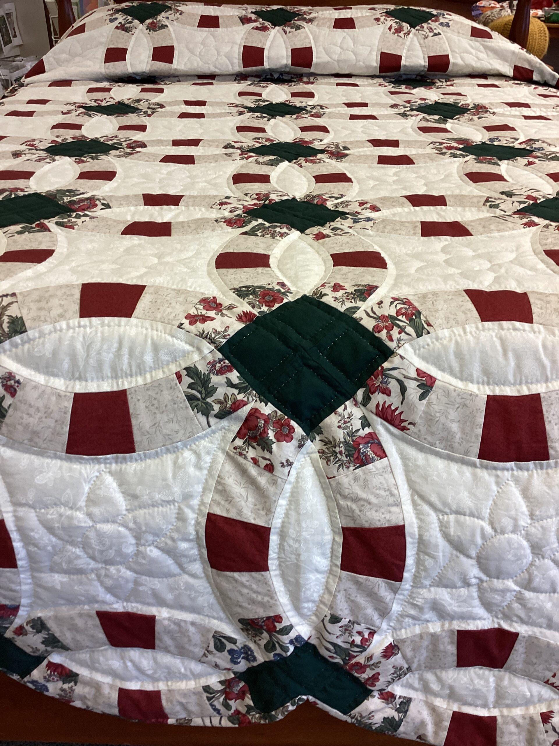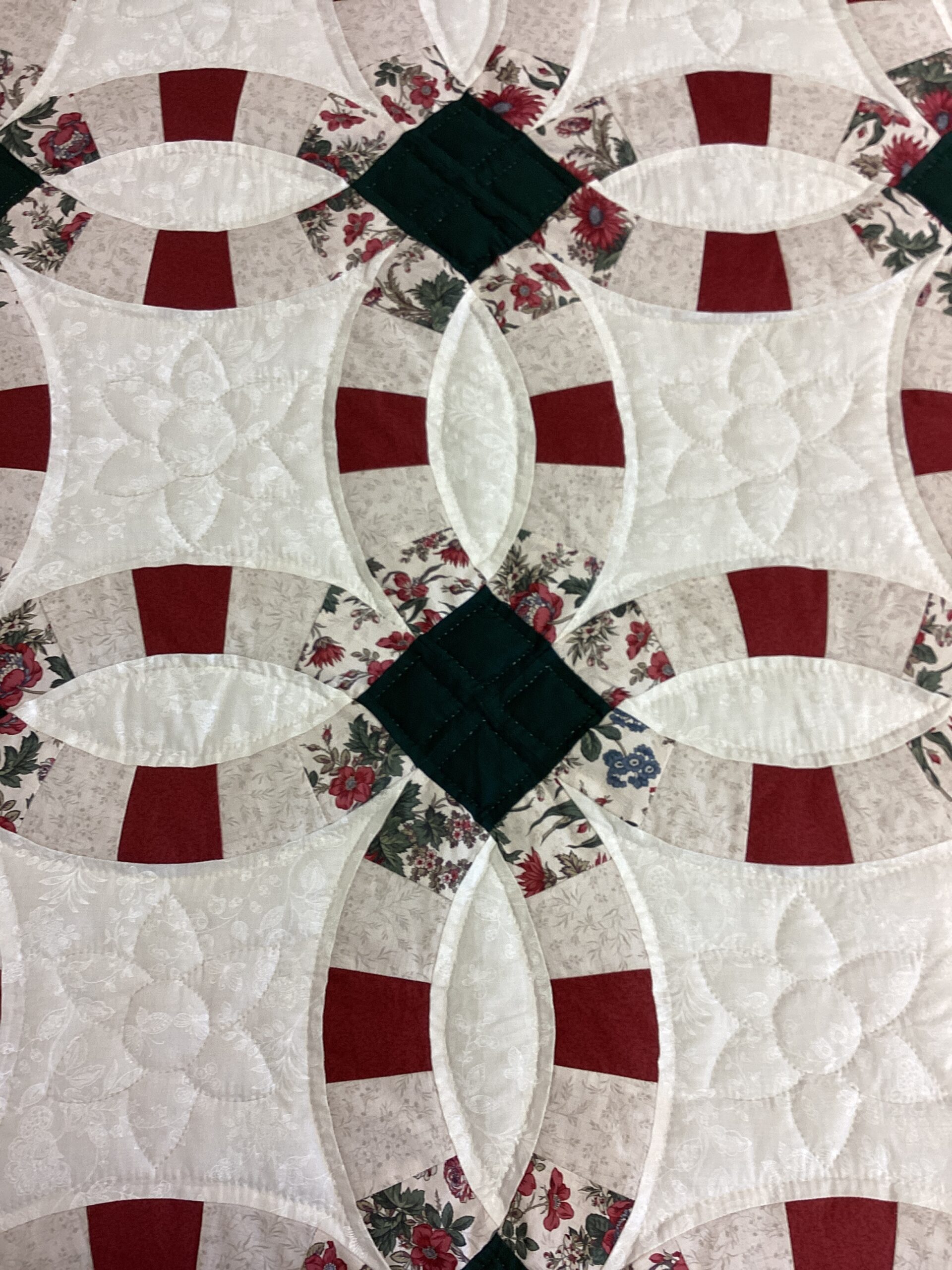 - This quilt features a traditional Double Wedding Ring pattern with interlocking rings. The color palette is happy with burgundy and an intense emerald green fabric. Lets not forget the florals that connect the interlocking rings. All of this is presented on a solid white background. On the reverse side is a white printed taupe fabric where you can see the lovely hand quilting thru out. The edges are skillfully created in scallop detail .