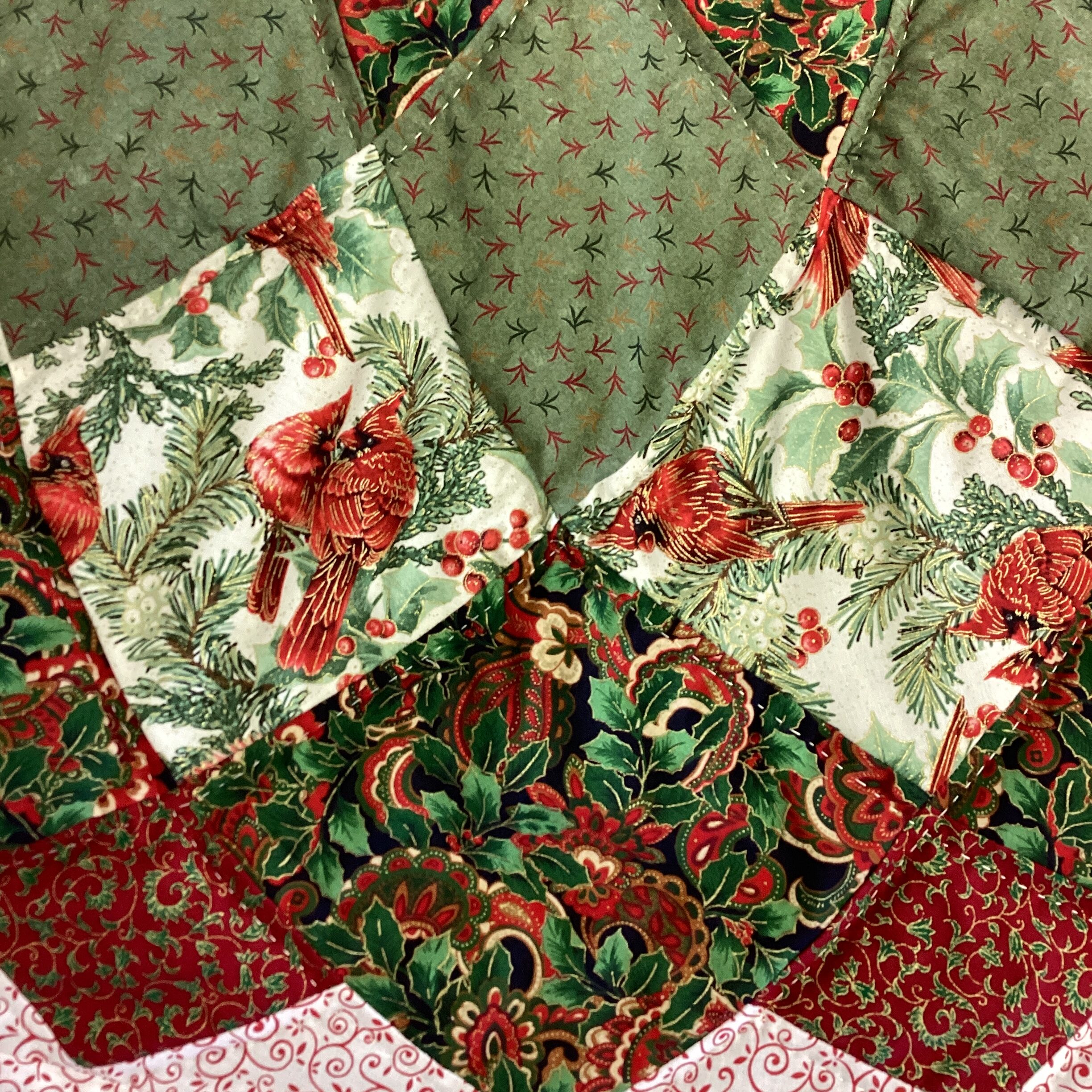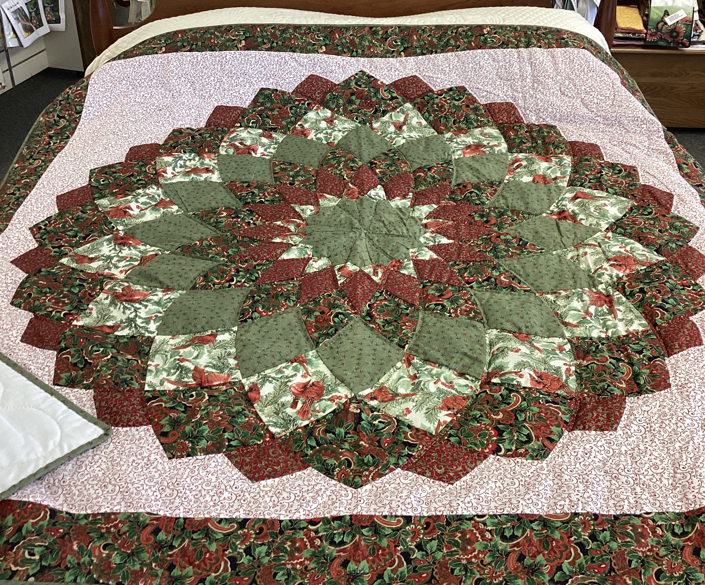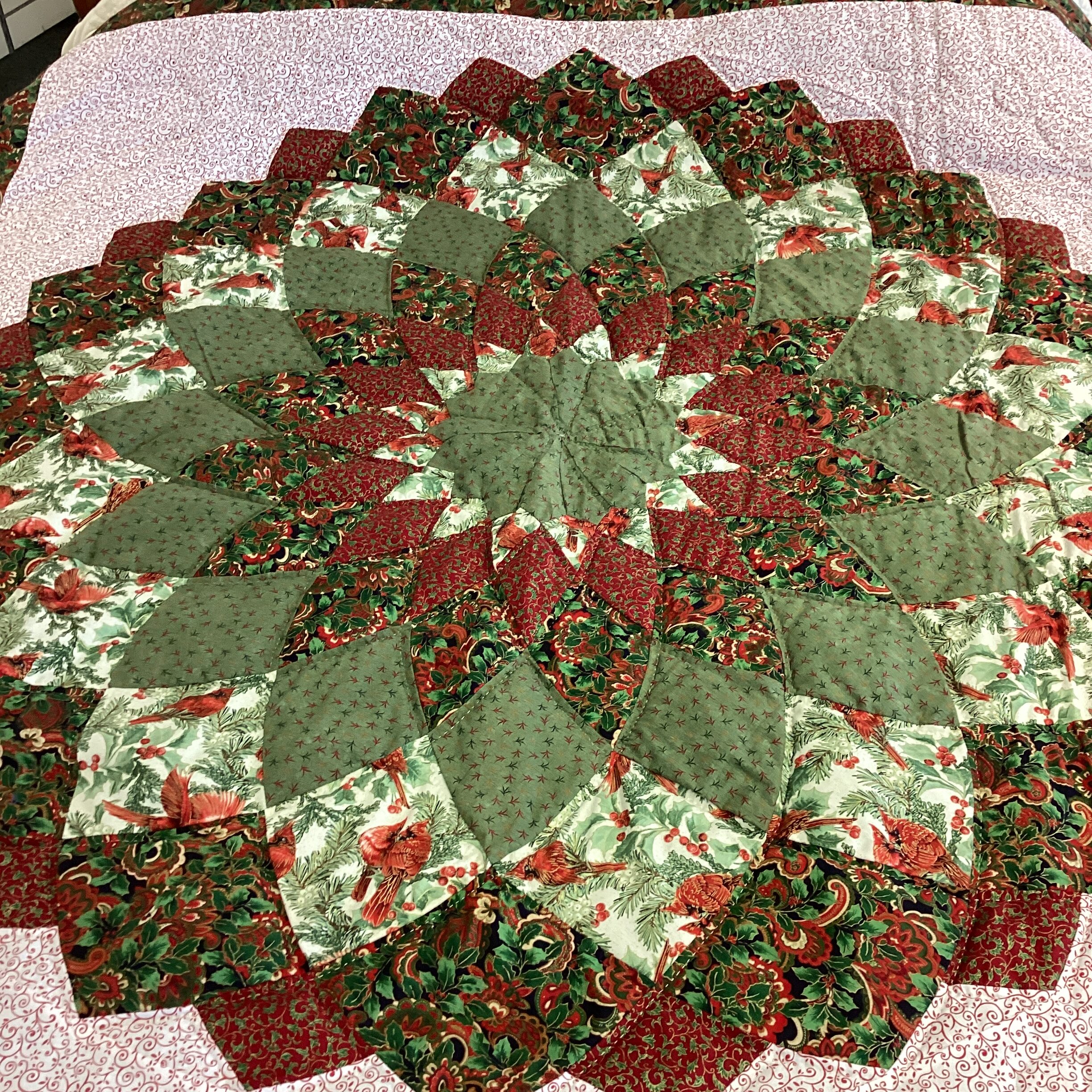 A quilt with the color scheme of Christmas in cardinal prints and shades of green and and brick reds. This pattern features large, overlapping flower petals arranged in a way that mimics the look of a dahlia flower.