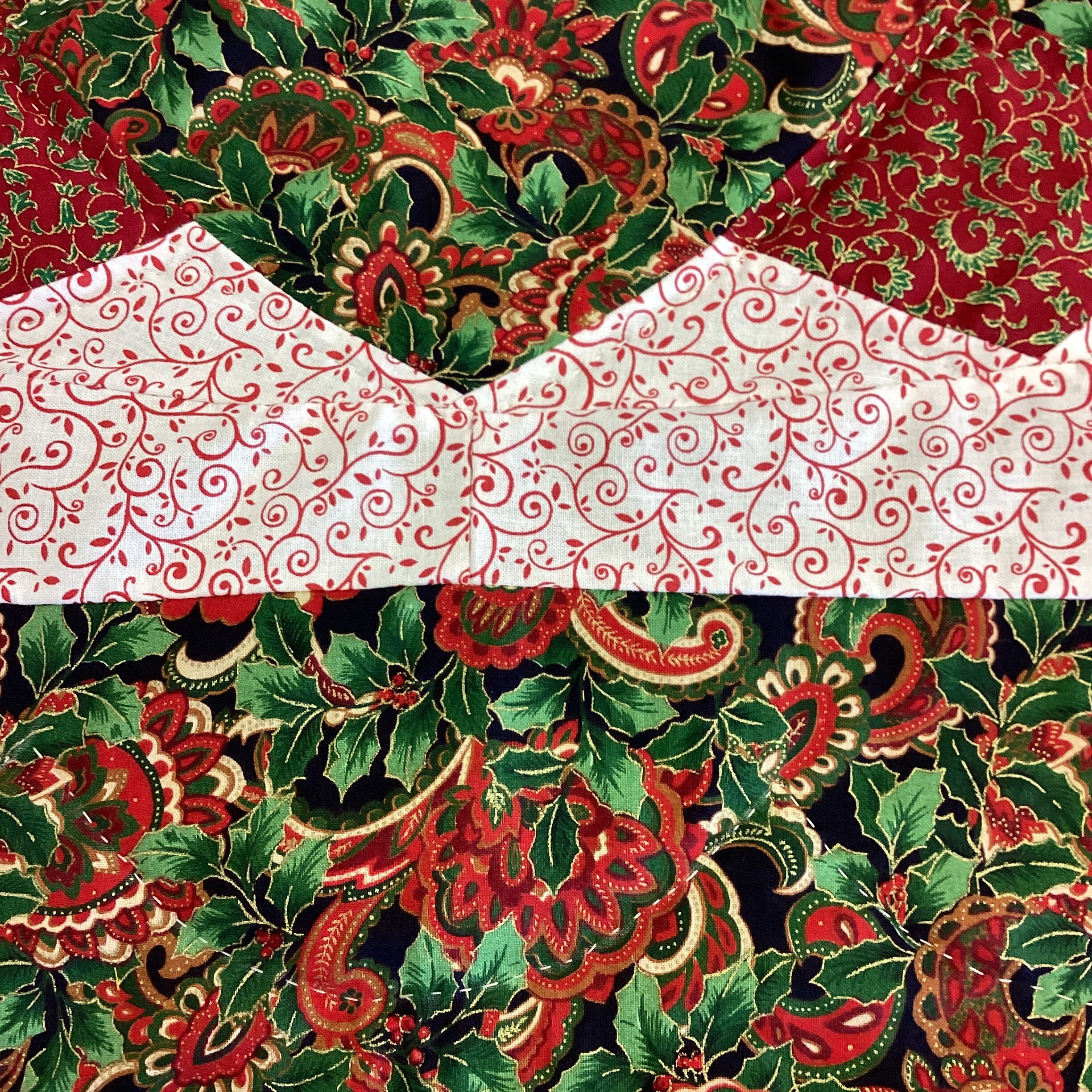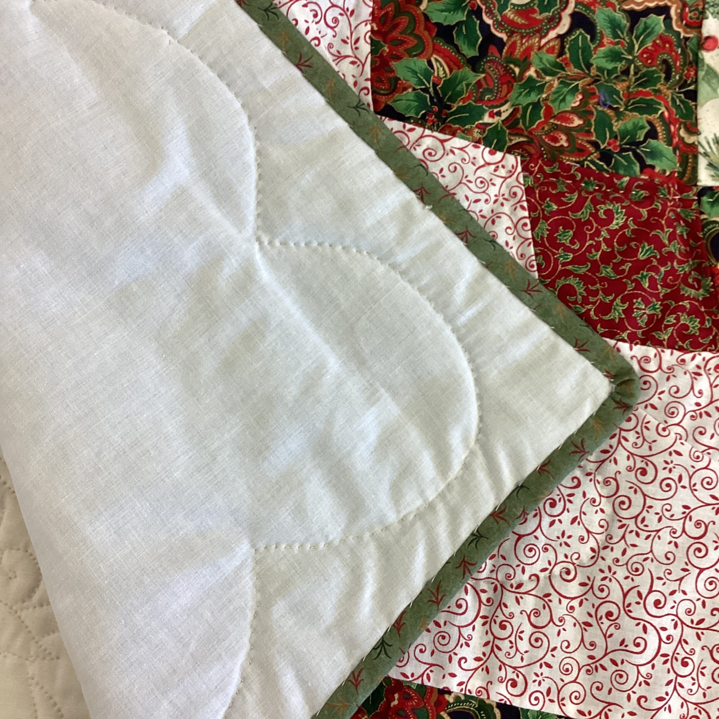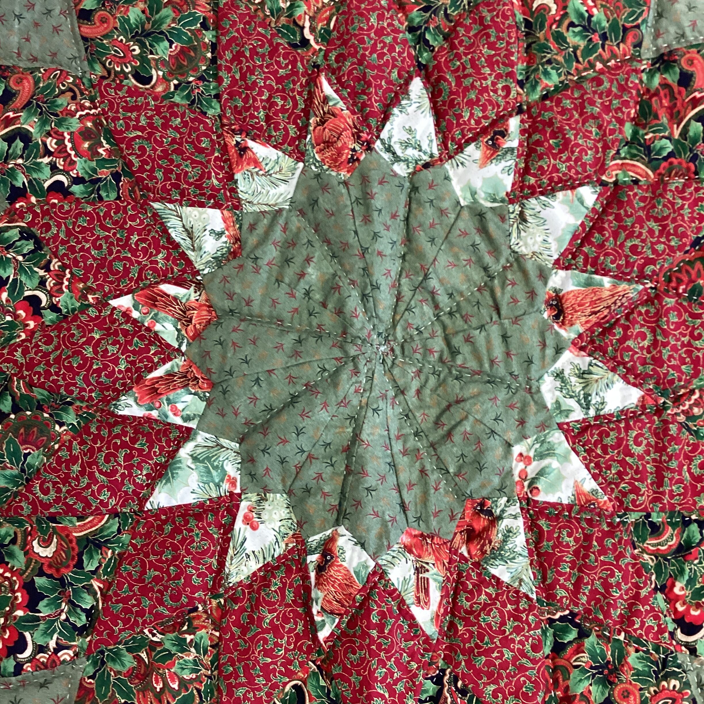The dahlia dominates the throw’s center, set against a creamy beige red scroll print. Though it uses only five fabrics, the repeating and scaling of prints— from large to small— creates a balanced, comforting look. The pattern alternates shades of green,, red, and and white printed cardinal fabric .The green fabric is printed with a soft texture. The white and red fabric is a tiny scroll that balances the larger sunflower print. Petal-shaped pieces form a dahlia as the design expands outward, with petals growing larger and repeating the center fabrics. A deep red, green and gold large floral print borders the quilt, anchoring the design. The backing is solid cream.