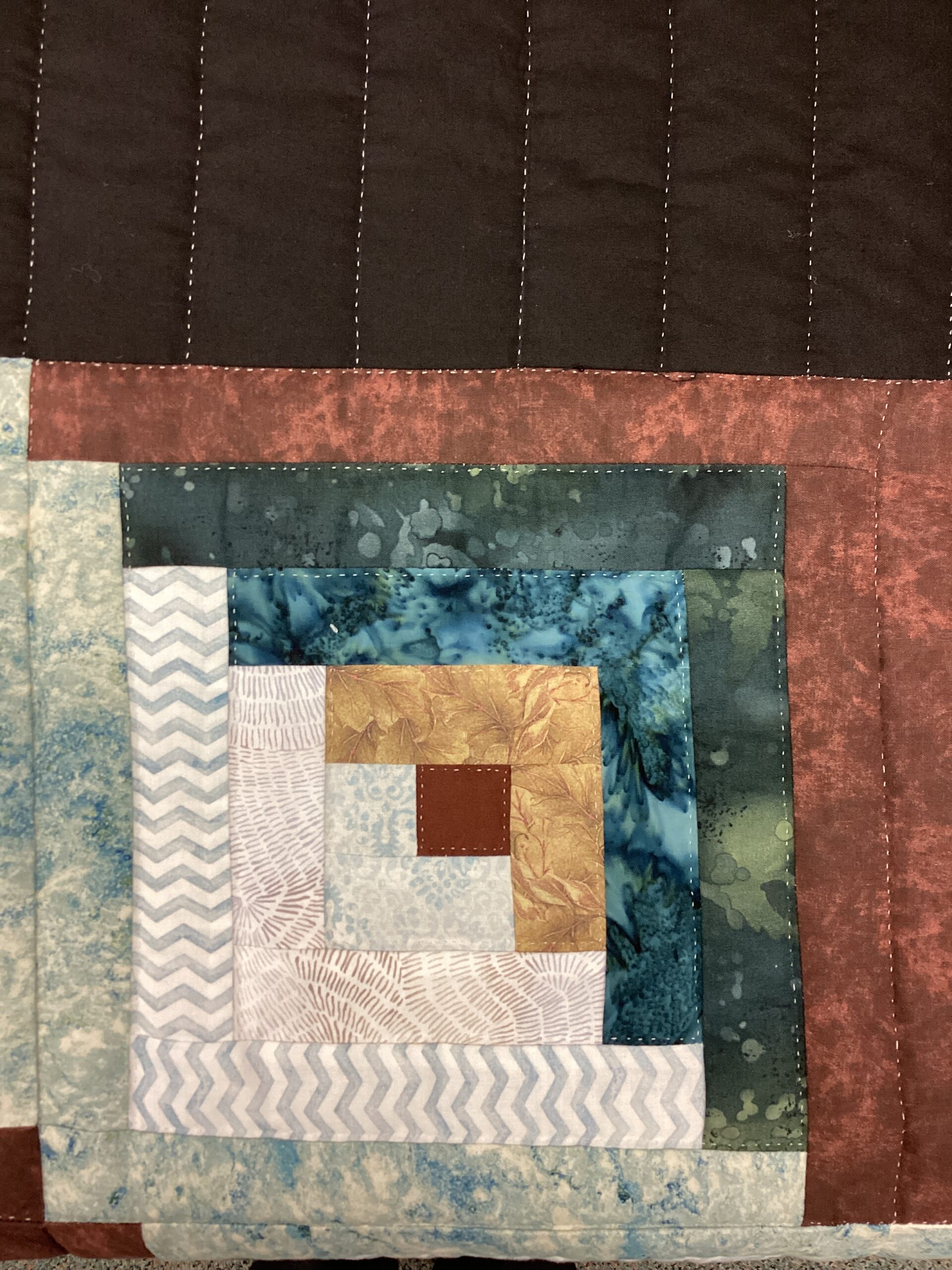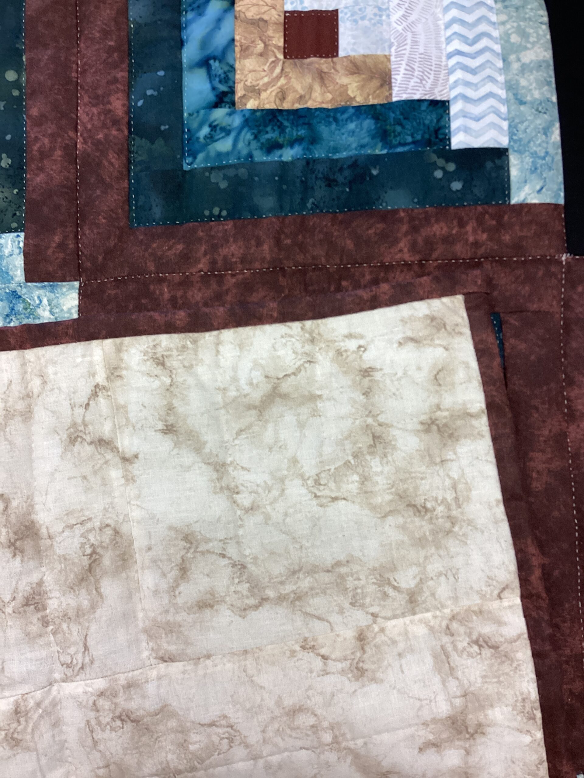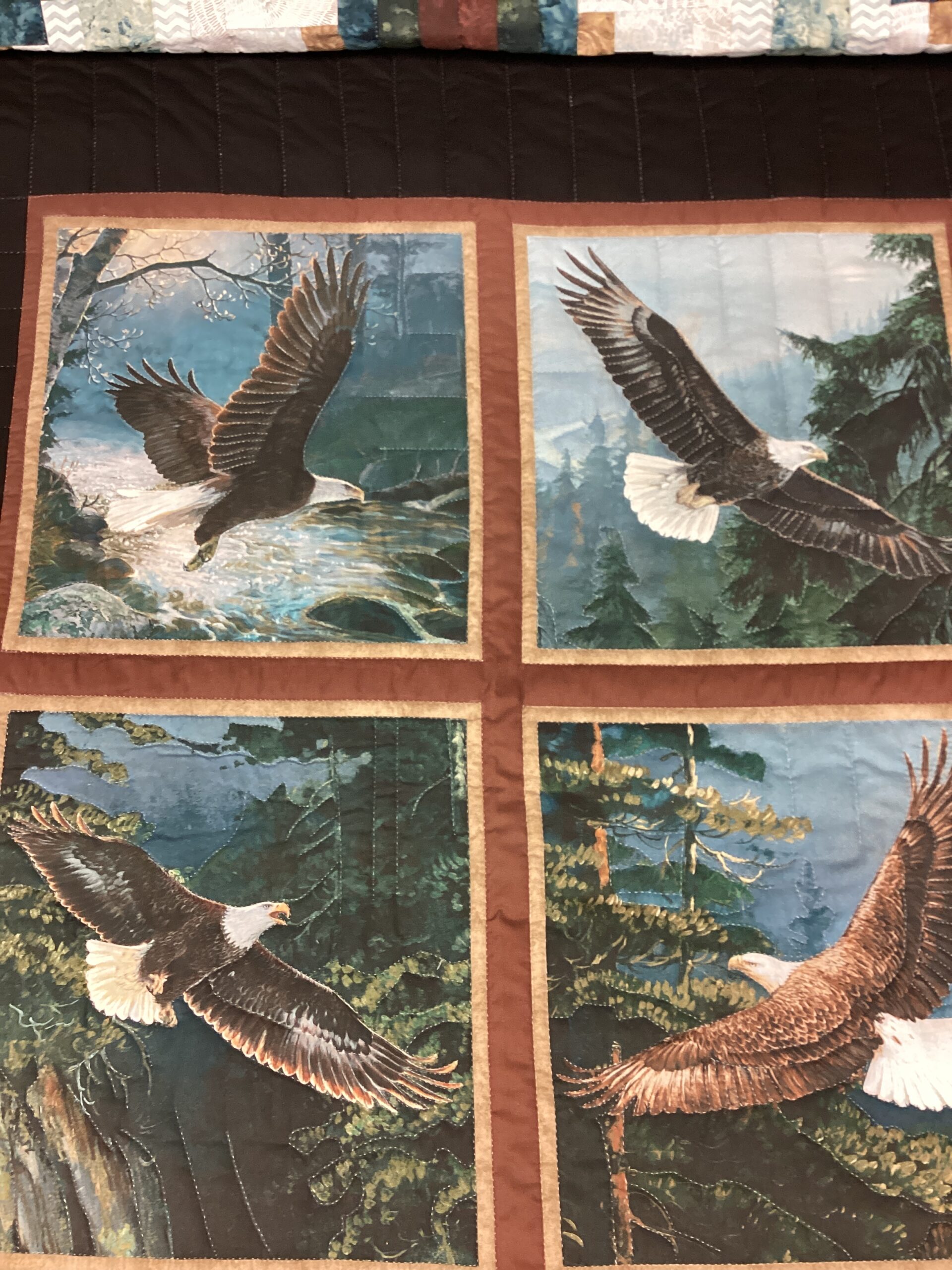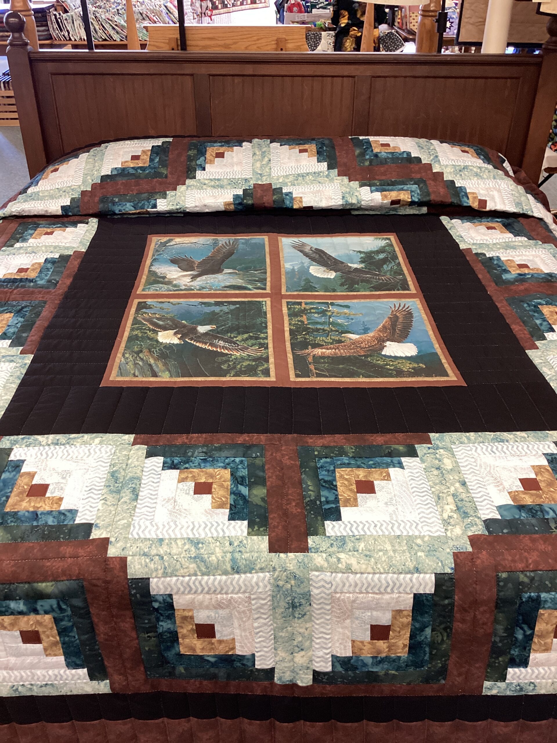 The traditional Log Cabin pattern with a hand-quilted, framed portrait of an eagle in flight in 4 different poses in the center. The diamond shapes are made by using contrasting light and dark fabrics in half of the log cabin square. This color palette features blacks, browns, beiges, and green to match the central panel. The backing is a beige marbel print.