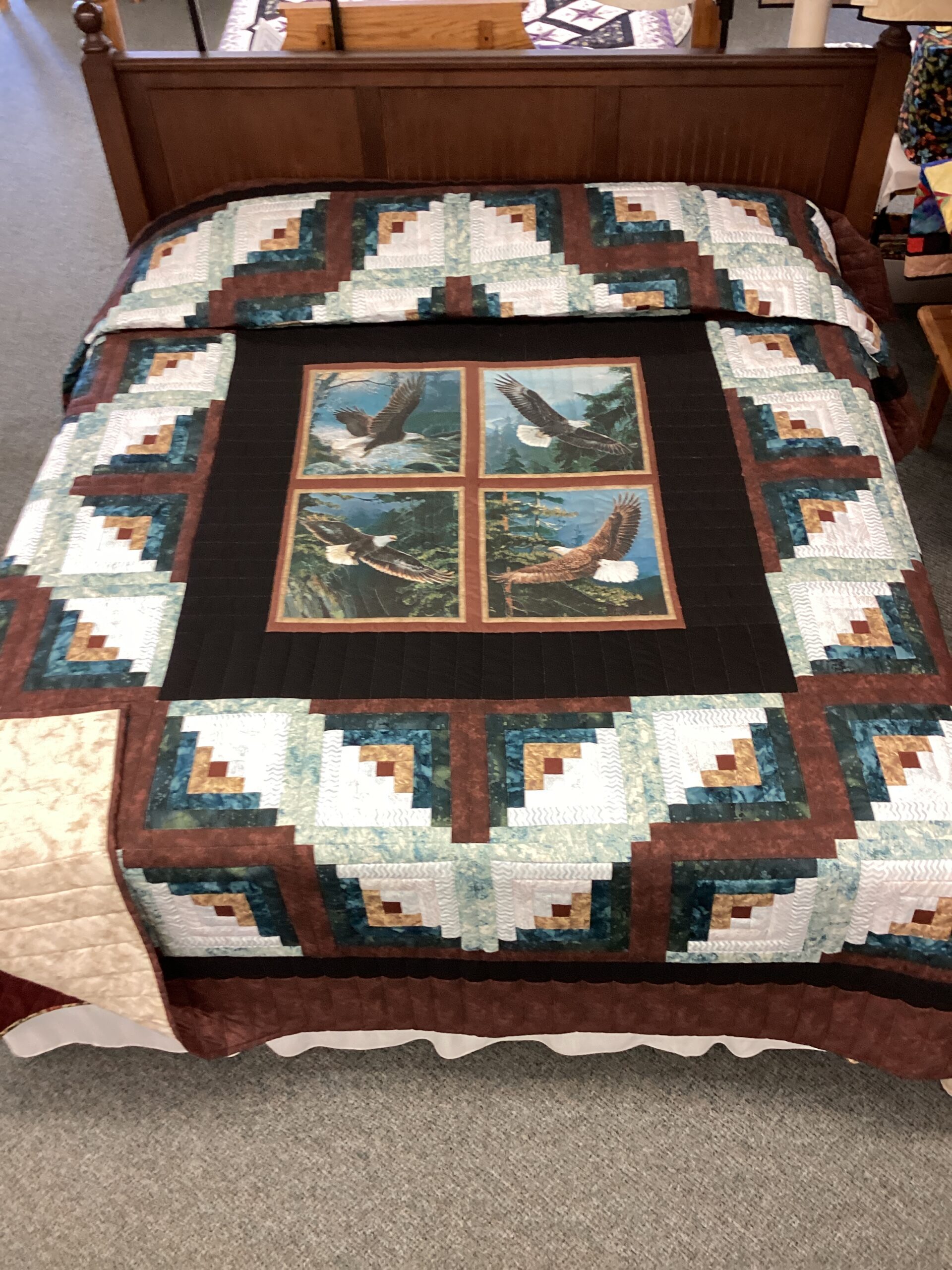 This traditional Log Cabin pattern features a majestic eagle in flight in 4 different panel poses in the center. The diamond shapes are created using contrasting light and dark fabrics in half of the log cabin square. The color palette coordinates with the central panel. The colors include brown, olive green, dark teal, gray, cream, and sky blue. The detail of the eagles and the surrounding trees is highlighted by delicate quilting. The border is dark brown. The backing is a sponge-style print in a cream allowing the quilt to be reversible. This is an Amish-made quilt with hand-stitched quilting.