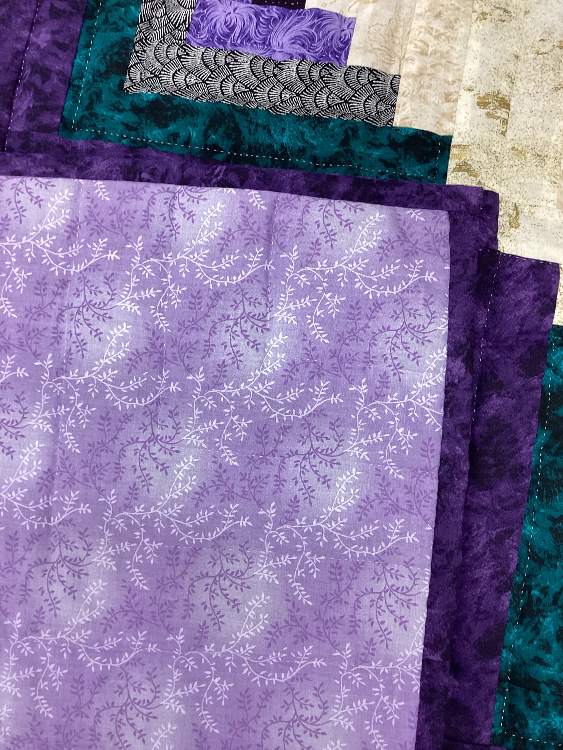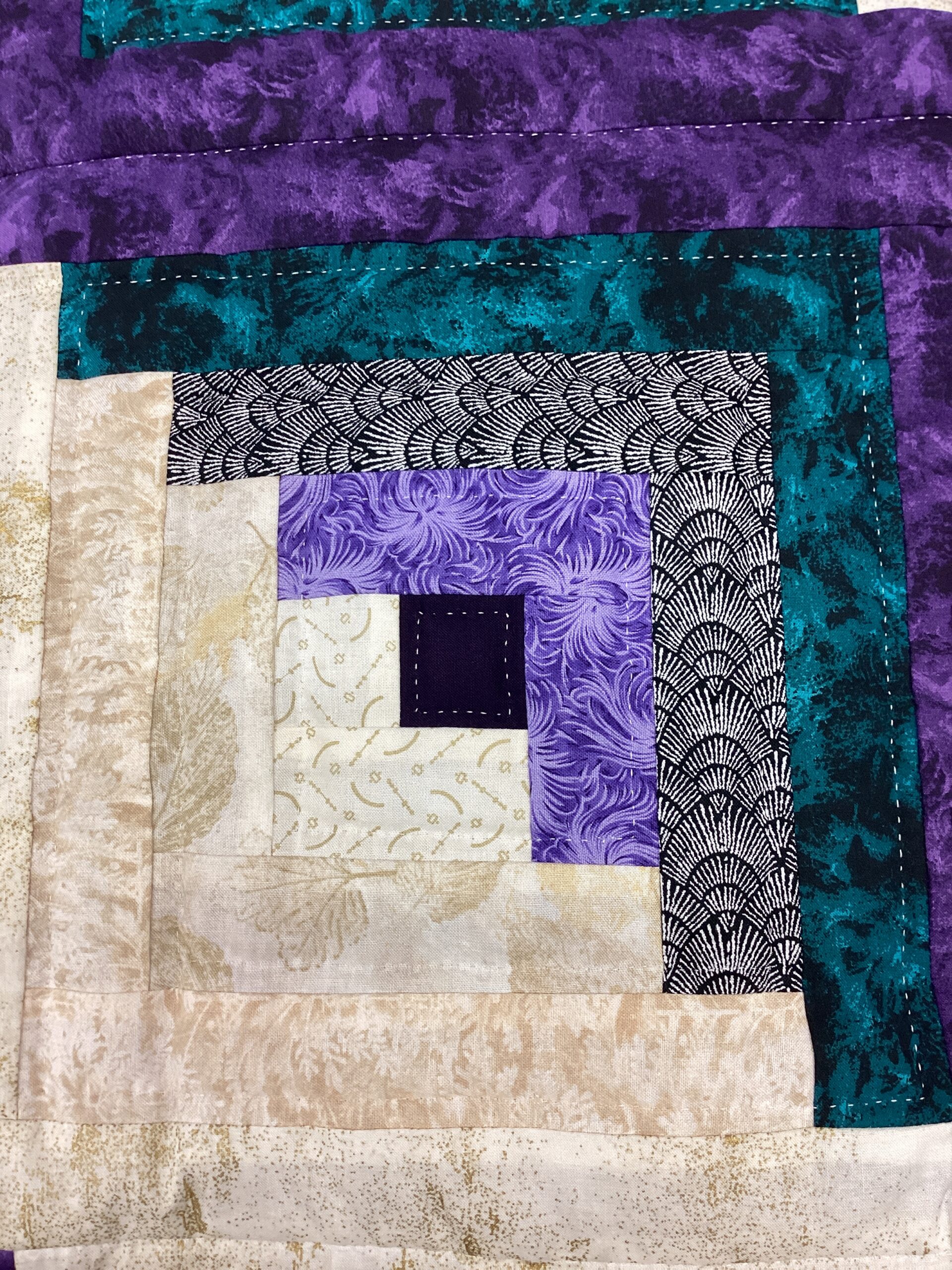 A traditional log cabin pattern in purple, cream, teal printed fabric with some black and white strips. The border is deep purple The backing is a violet with pillowy clouds and a vine print