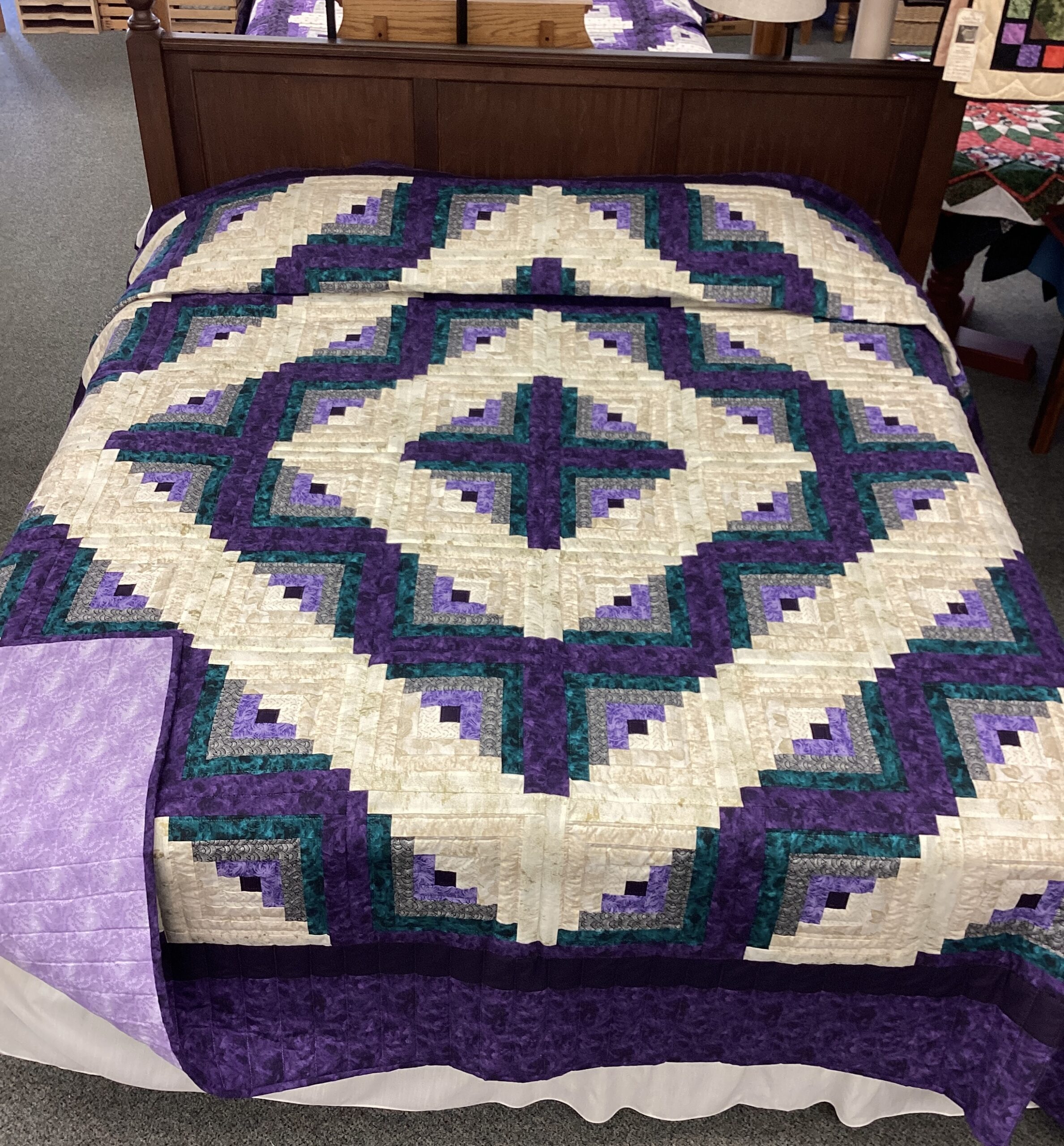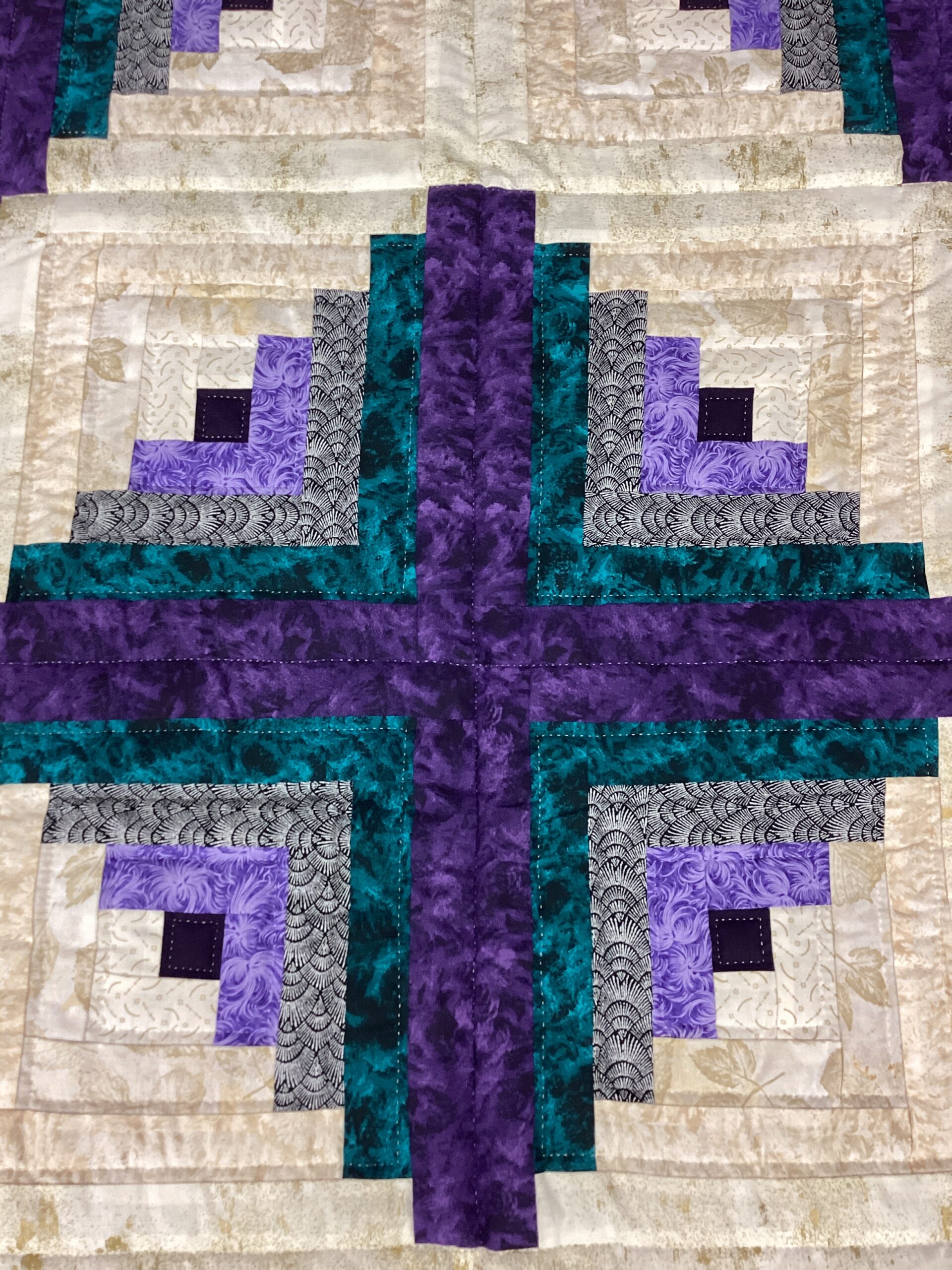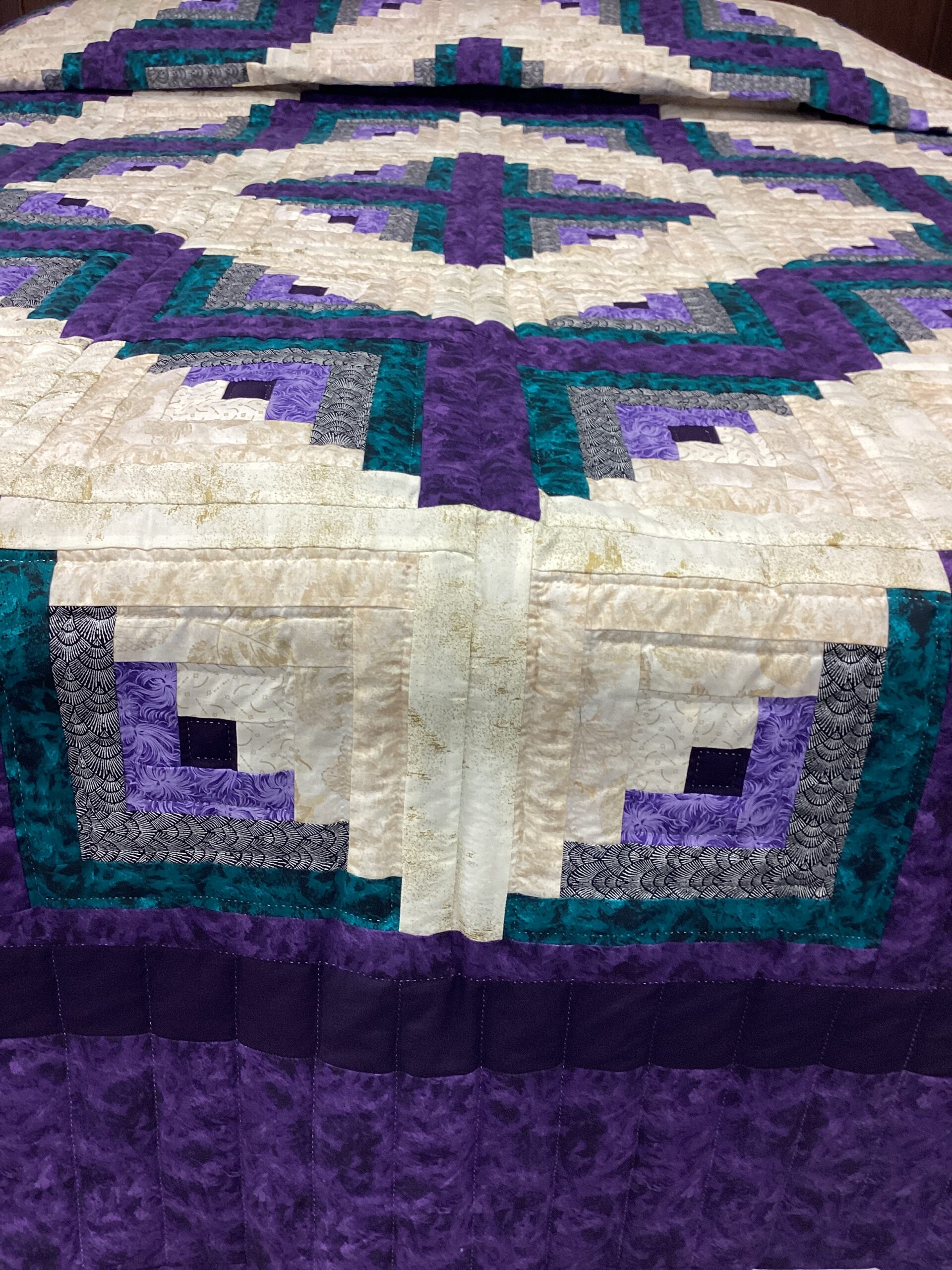 The beautiful quilt features the traditional Log Cabin pattern created with fabric that is in the color of purple, teal, cream and also a violet. The diamond shapes are made by using contrasting light and dark fabrics in half of the log cabin square. The border is a deep purple and the backing is violet with white looking puffs of cotton. There is also a viny print.