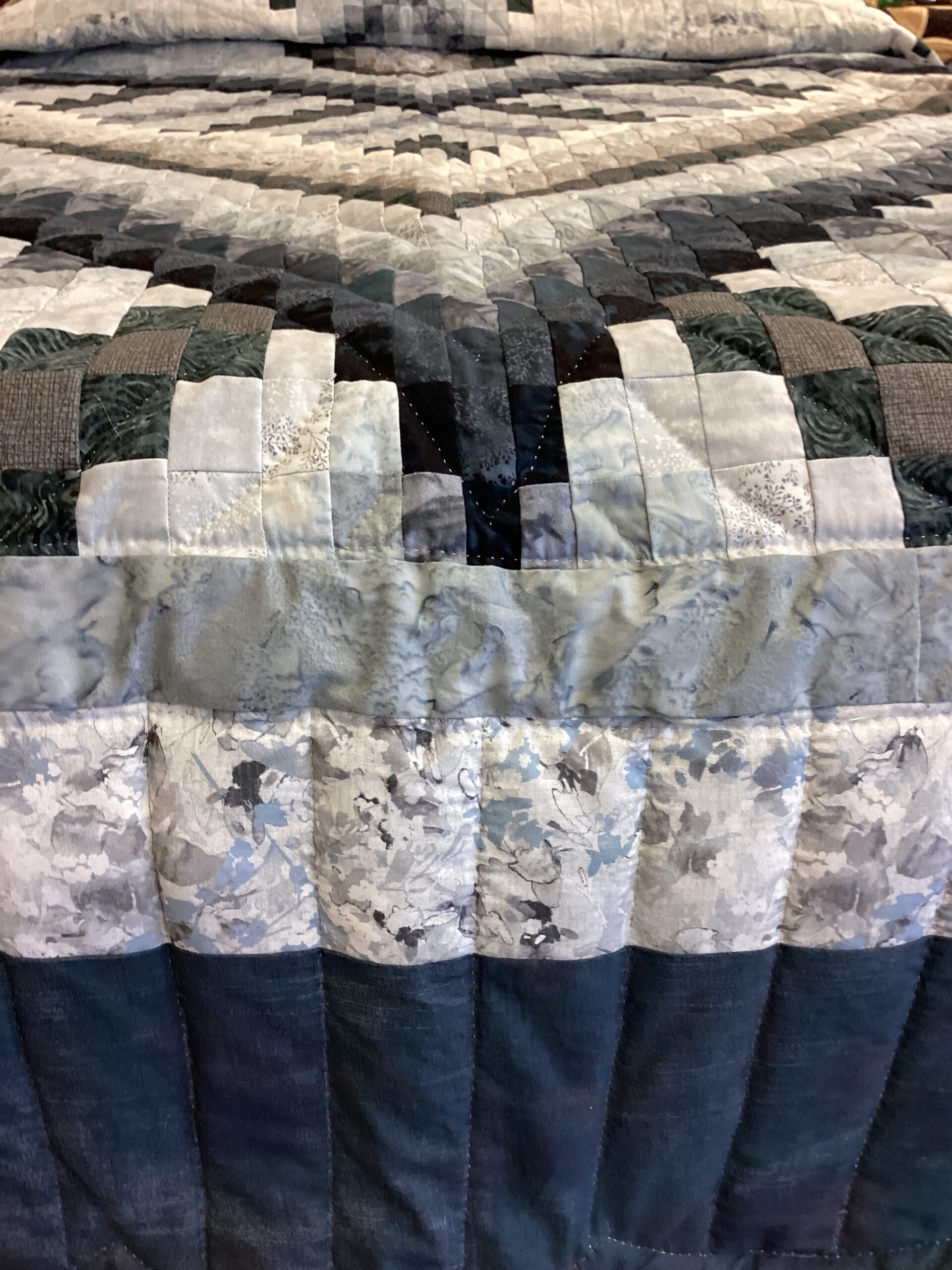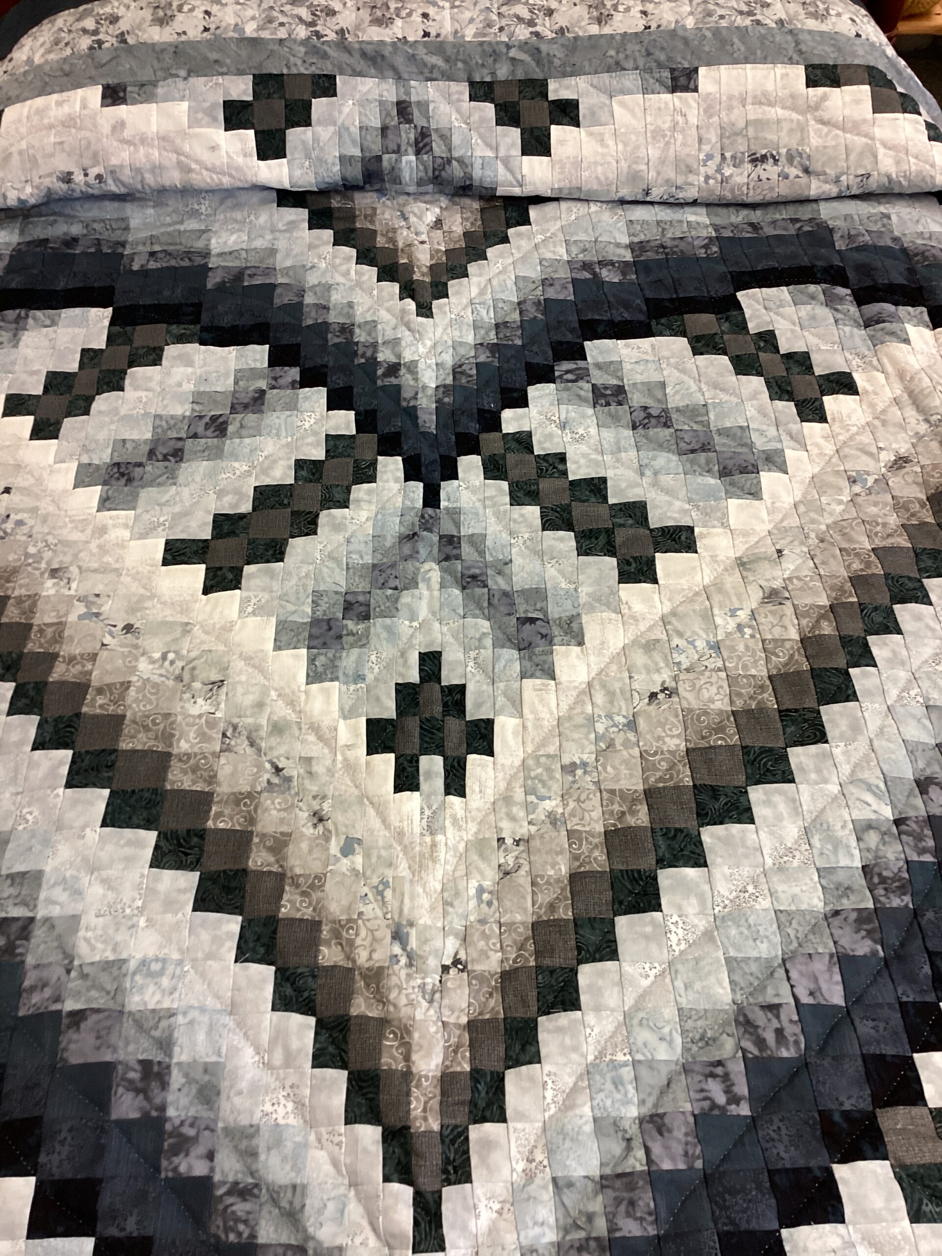 This beautiful bargello quilt features a heart in shades of navy, light and dark blue, , and grey with a deep blue border. The backing is shades of gray with a delicate leaf print, making this quilt reversible.