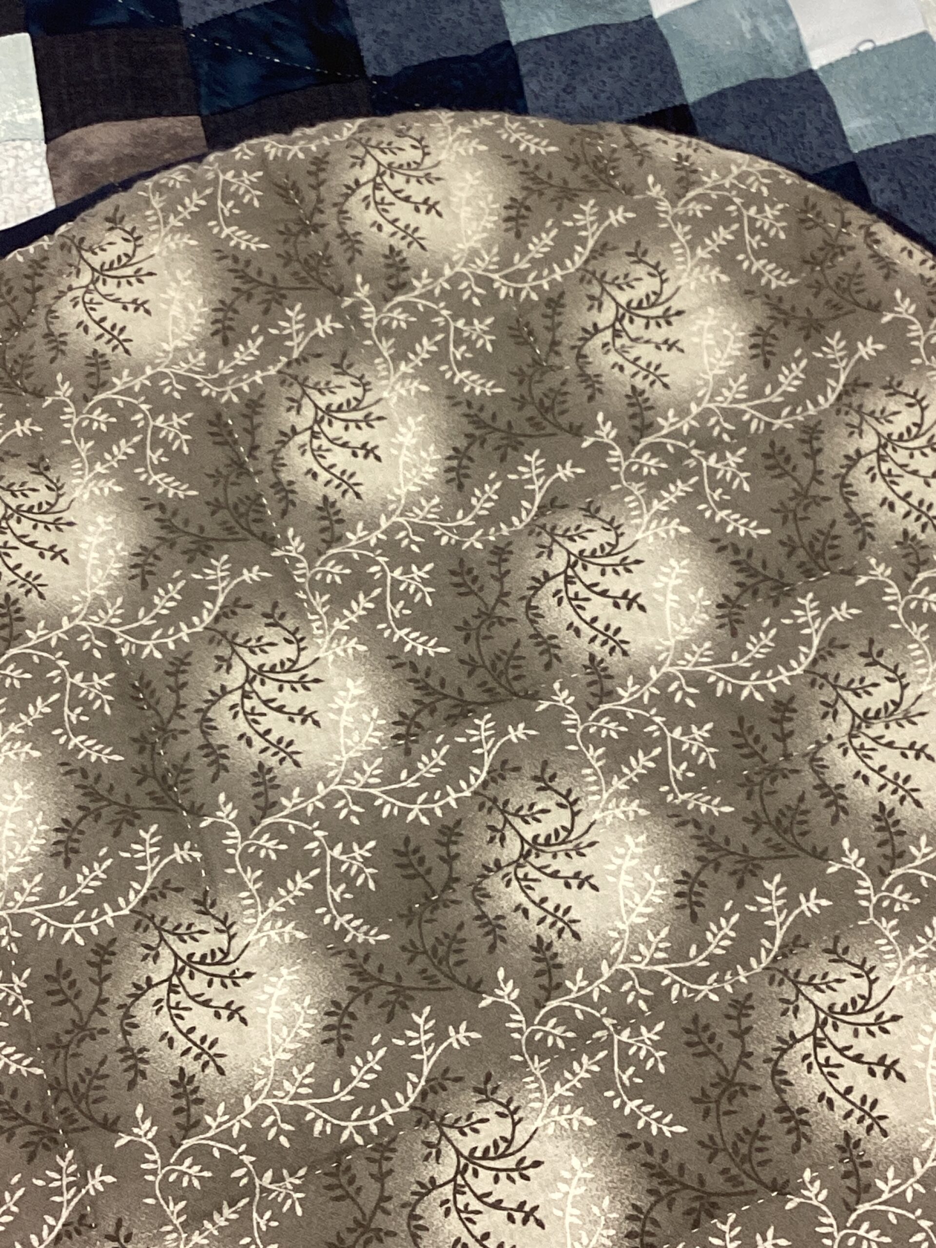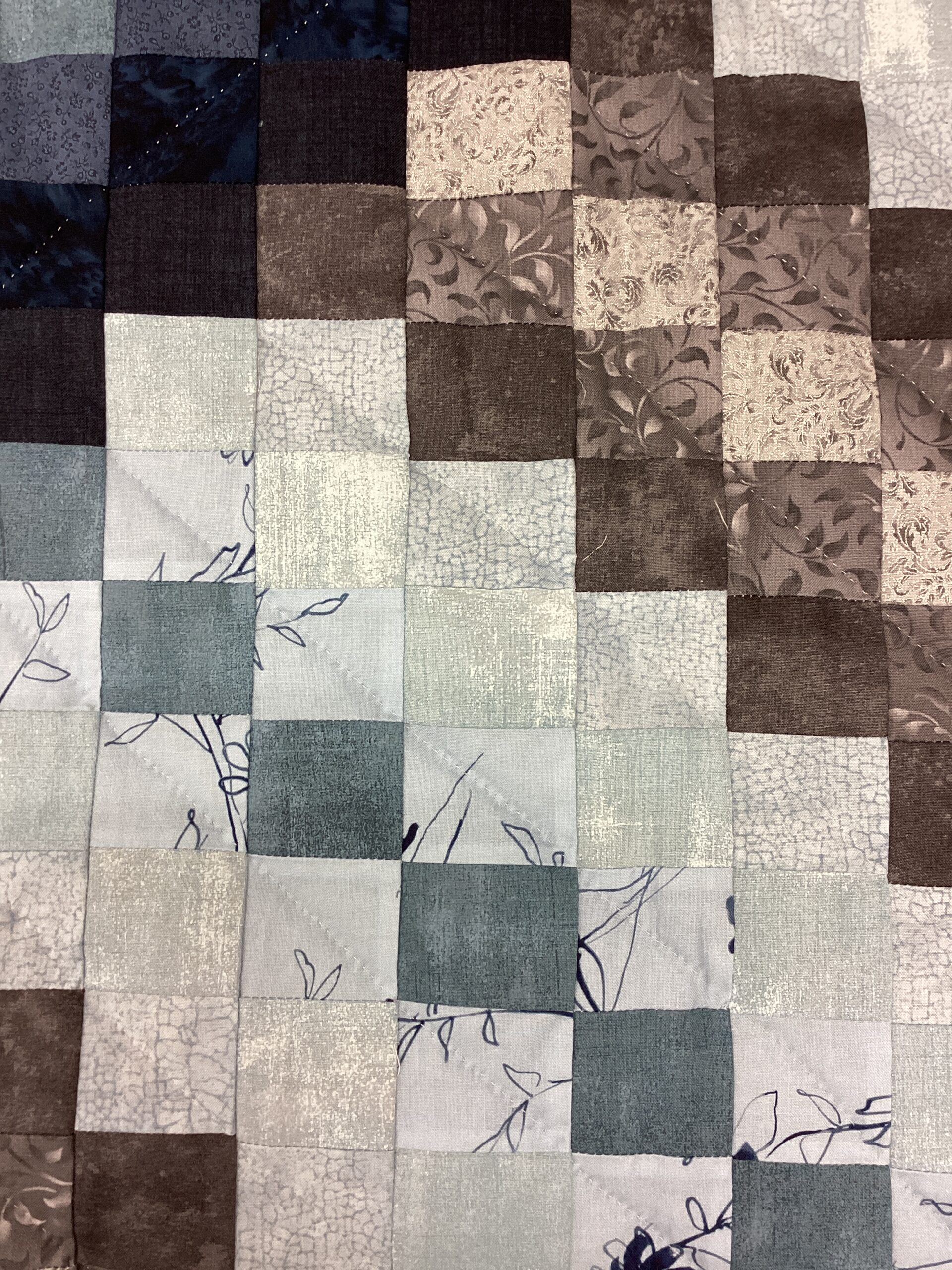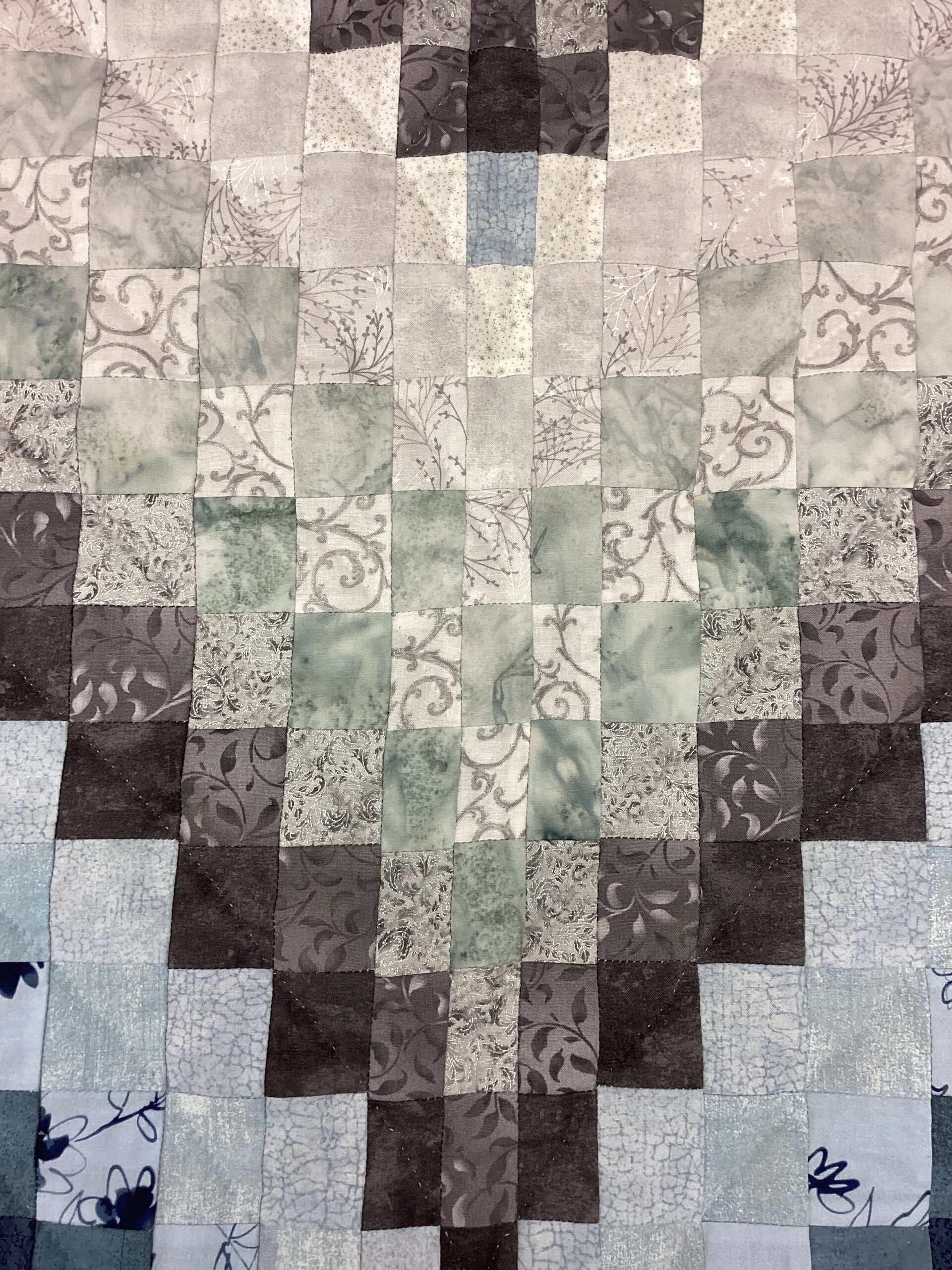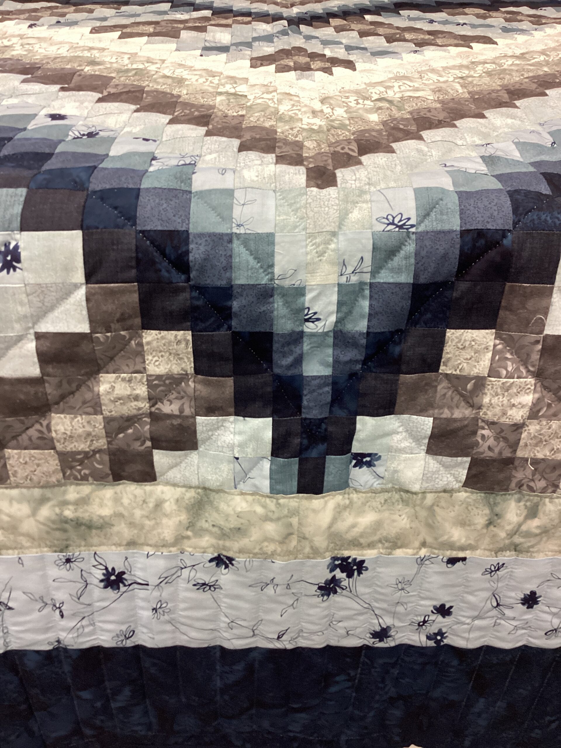 This beautiful bargello quilt features a heart in shades of navy, light and dark blue, , and grey with a deep blue border. The backing is shades of gray with a delicate leaf print, making this quilt reversible.