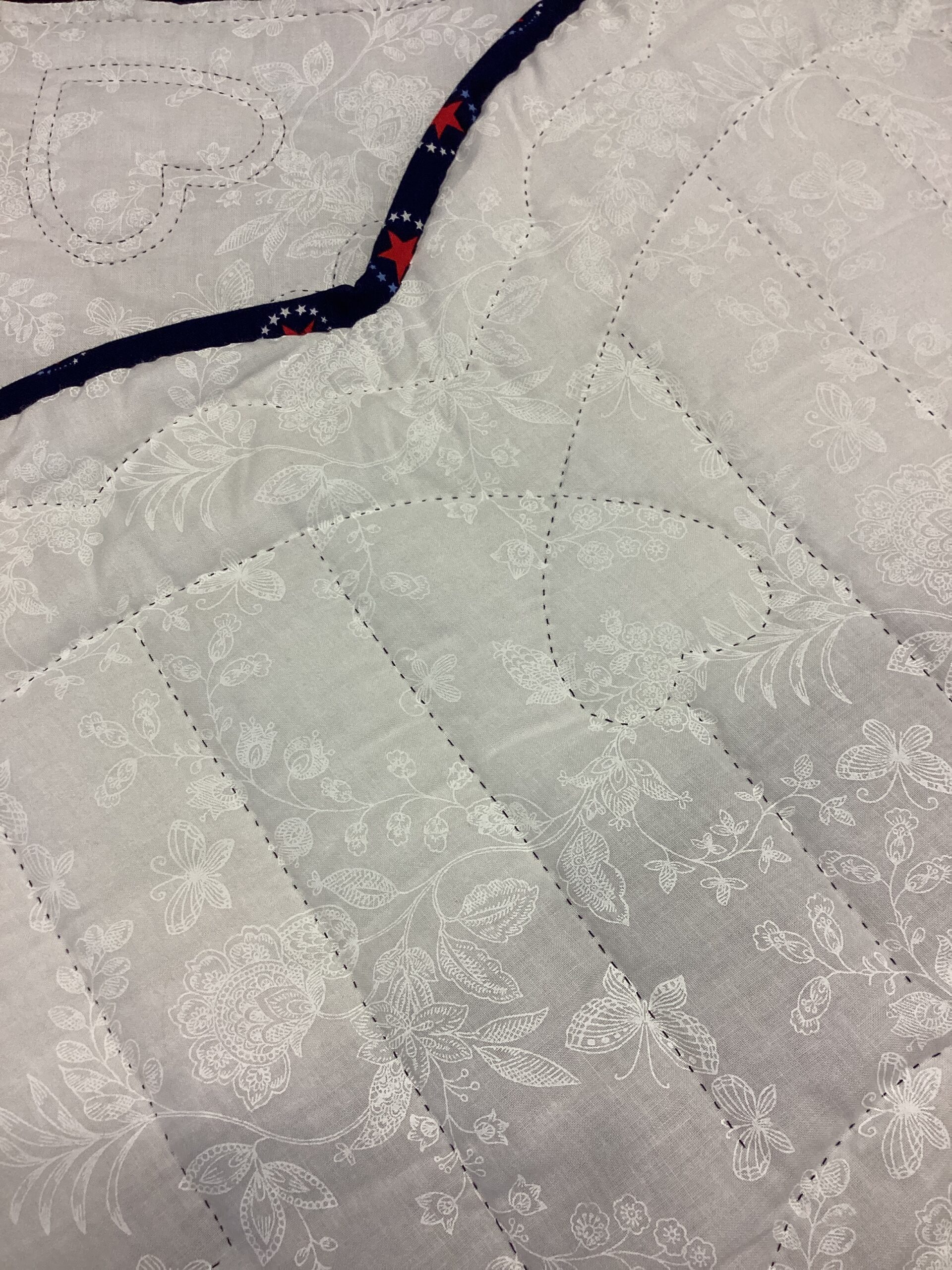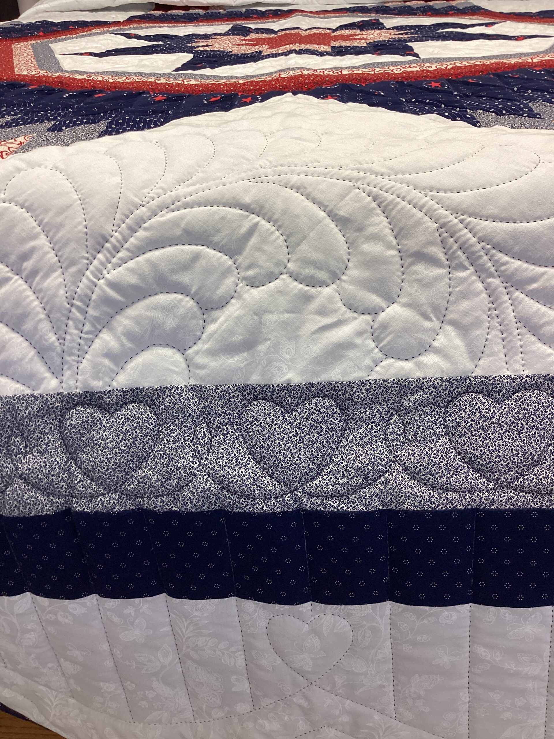 A beautiful center star surrounded by an octagon border in red, white and blue With tiny hand stitching and meticulous piecing, done in patriotic red, white and blue fabric.
