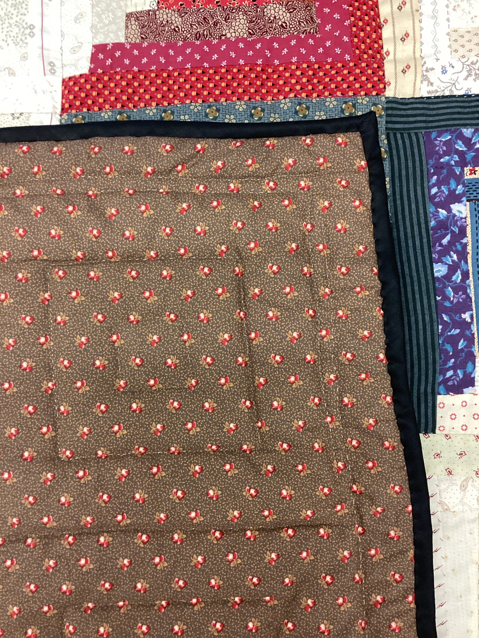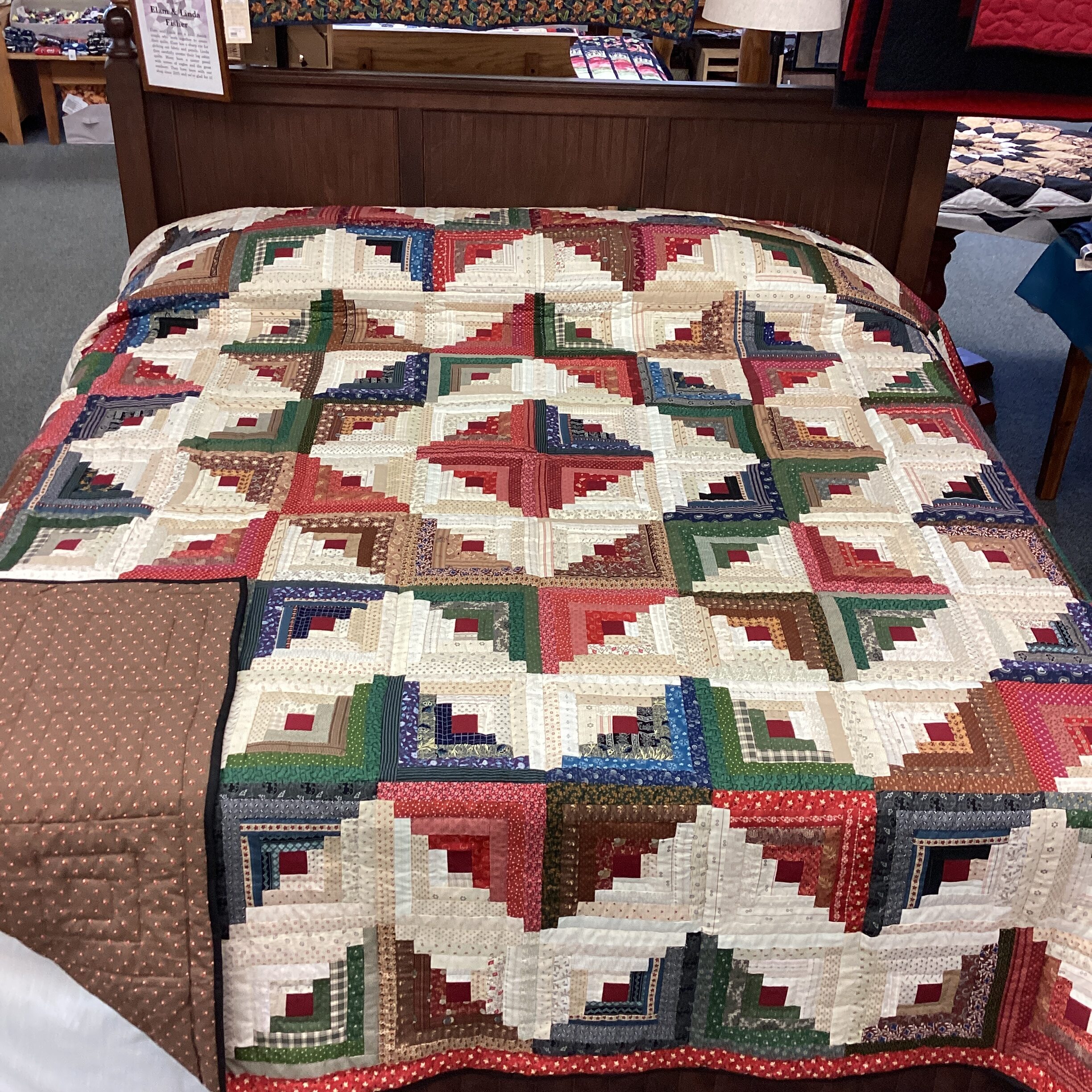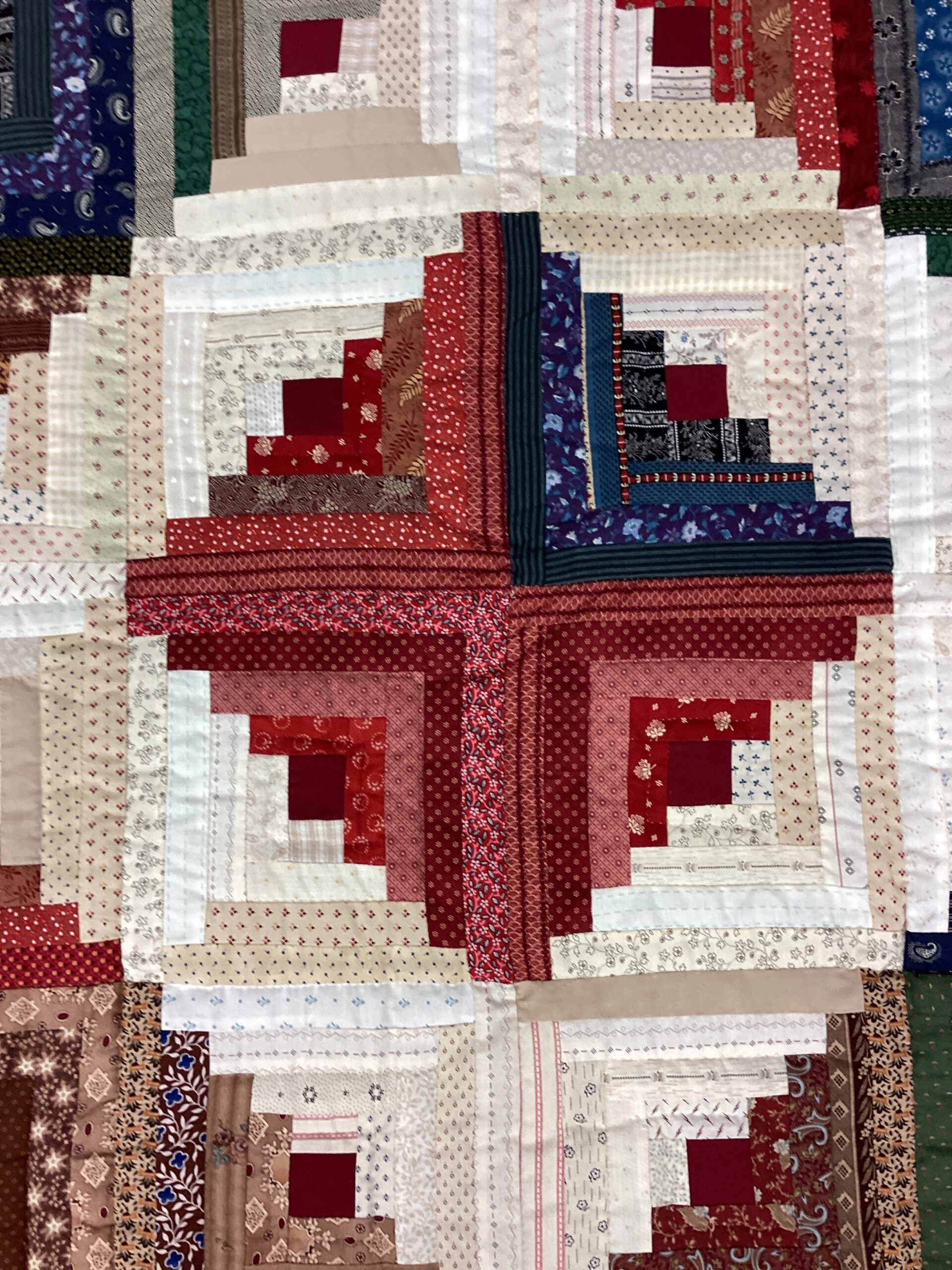 The traditional log cabin pattern in vibrant colors of the rainbow, with the prominent colors of red white and blue There are also colors of cream as well and don’t forget the greens. The border is a pretty red with a leaf pattern . The backing is beautifully quilted on a brown printed floral fabric