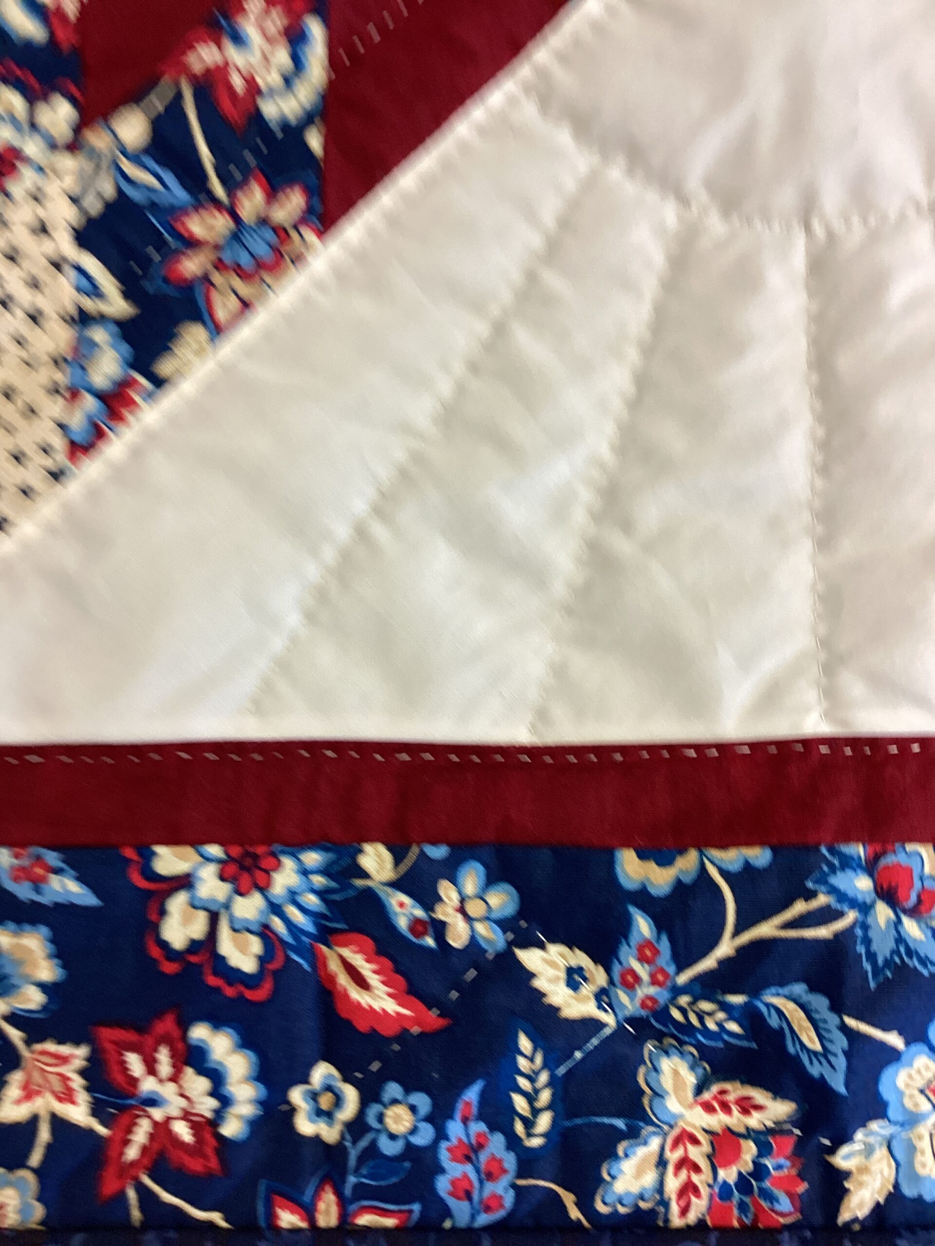 Creamy white with red stars, blue floral, solid deep red and blue make up this beautiful throw