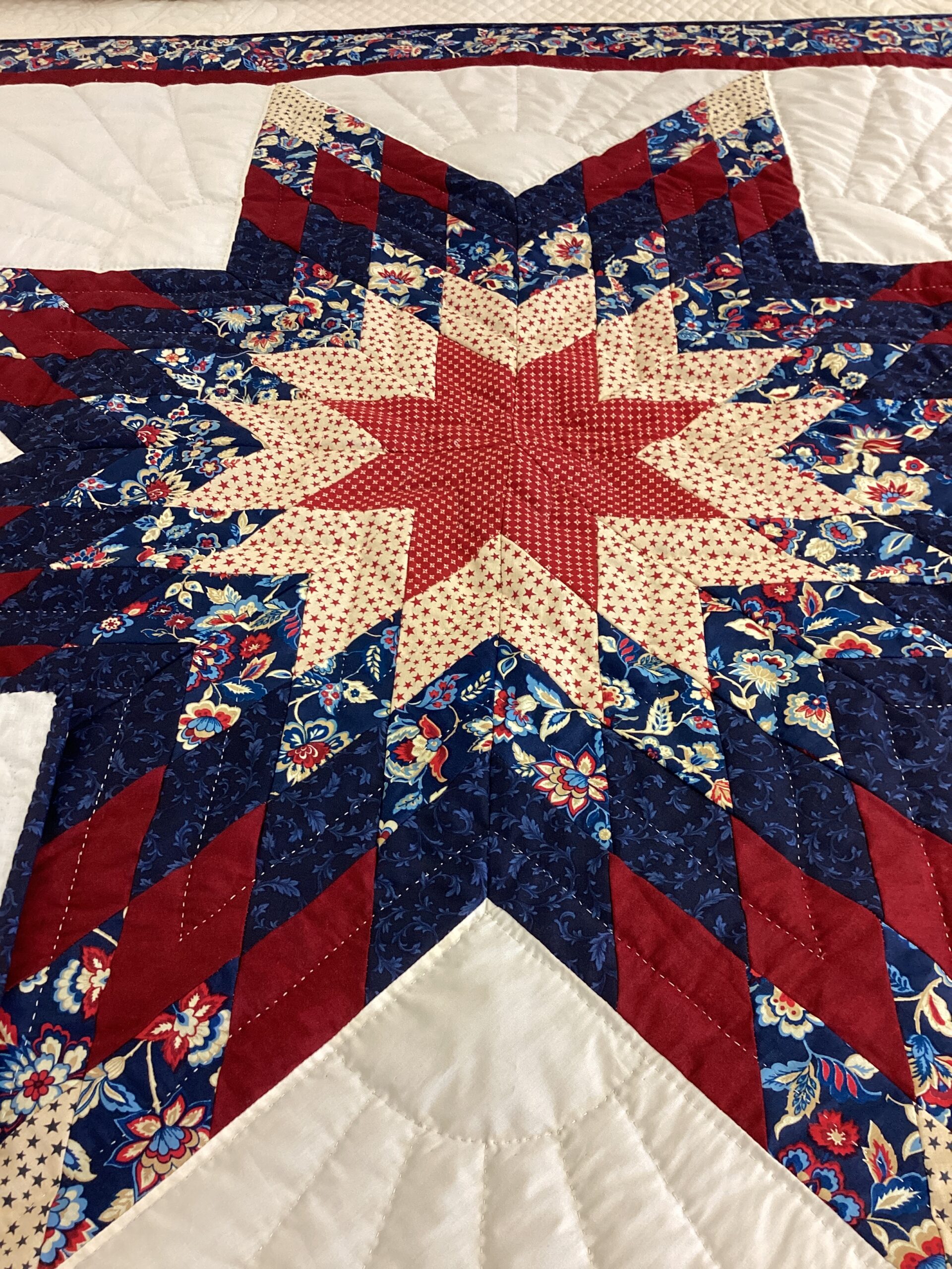 The traditional Lone Star pattern is created  with a reminder of our country in patriotic colors and a floral border. The backing is a creamy white.