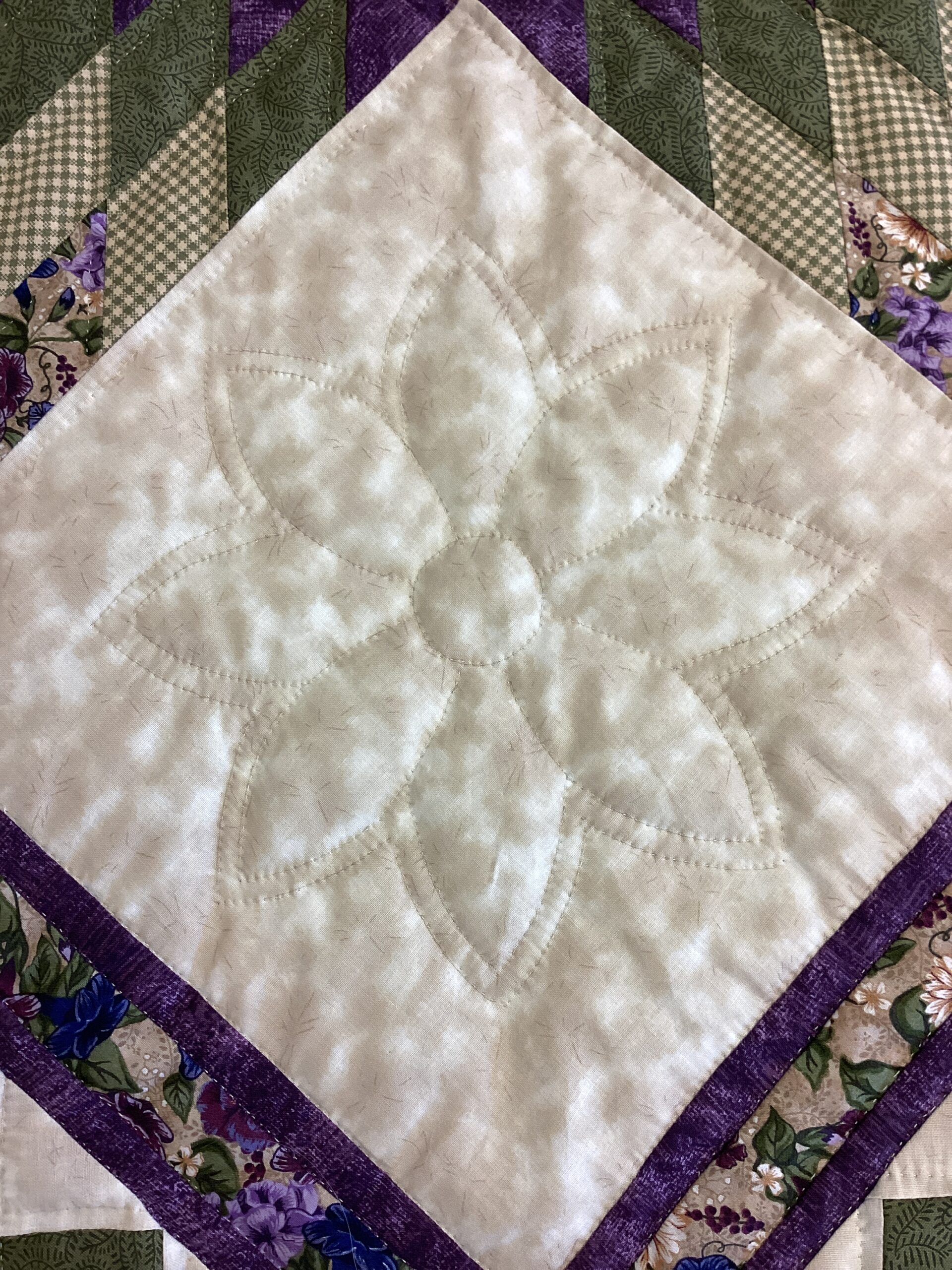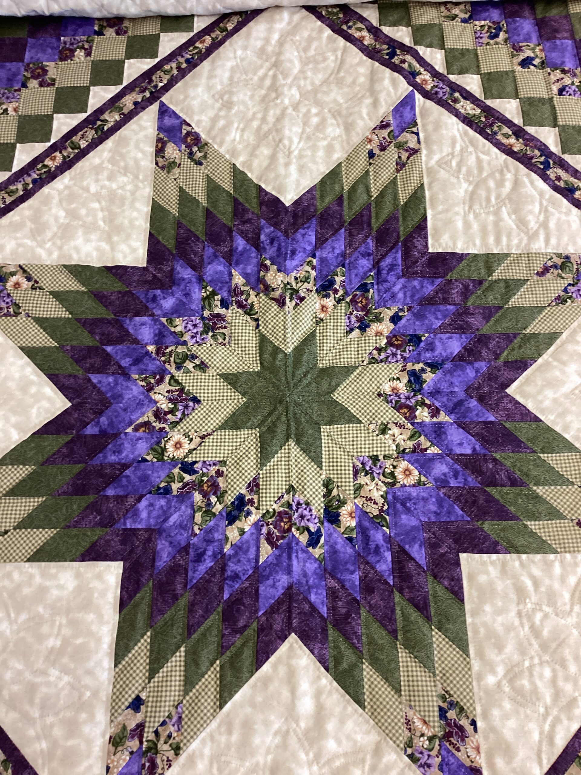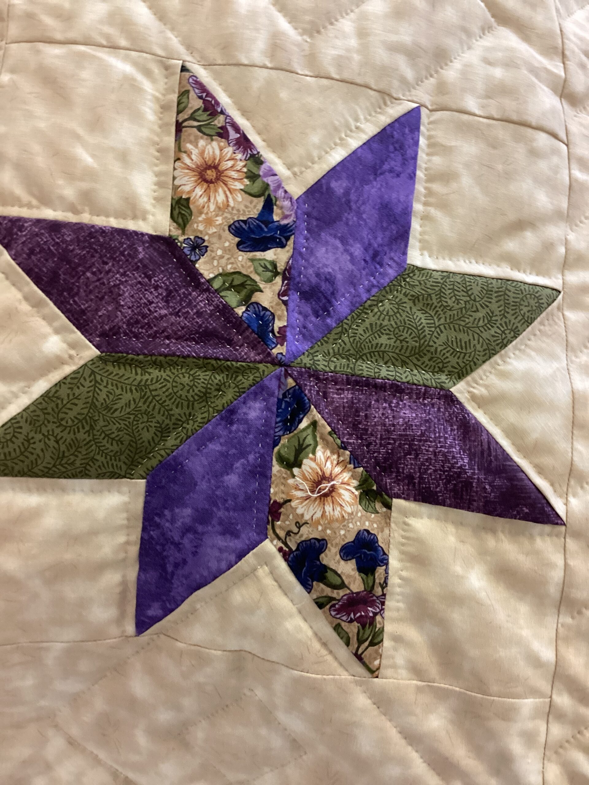 A beautiful center star surrounded by smaller squares and a fabric border. With tiny hand stitching and meticulous piecing, done in beautiful shades of purple , green and cream in solid as well as printed fabrics as well.