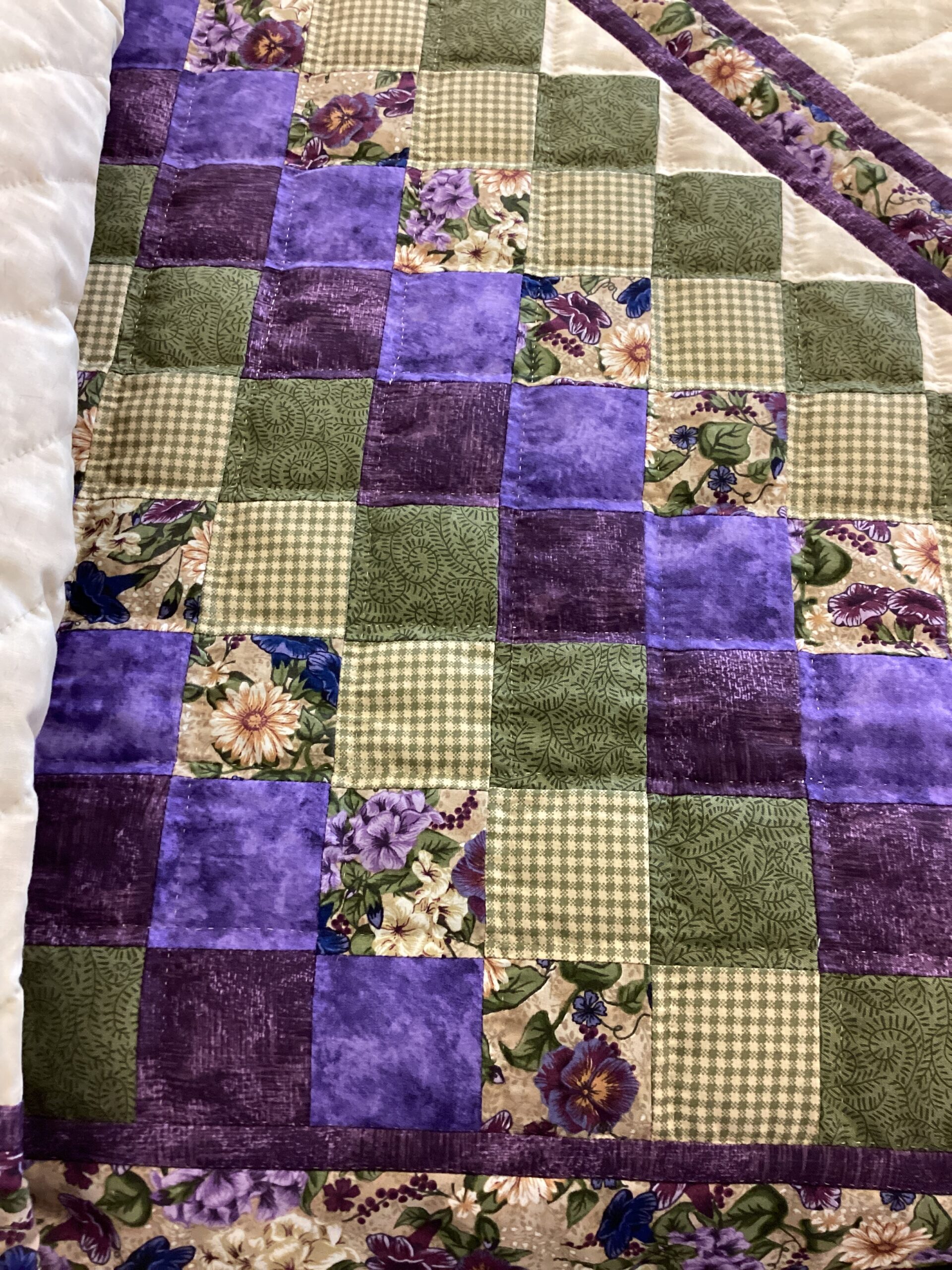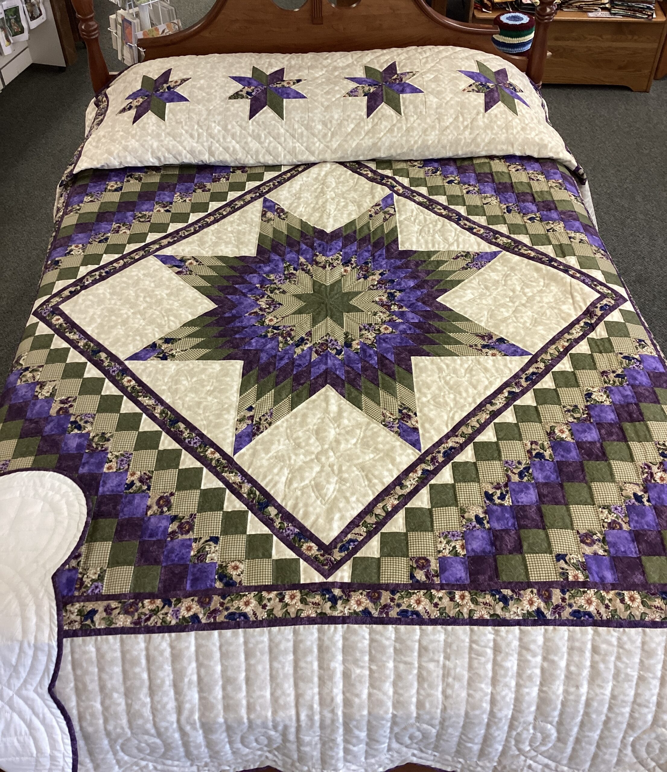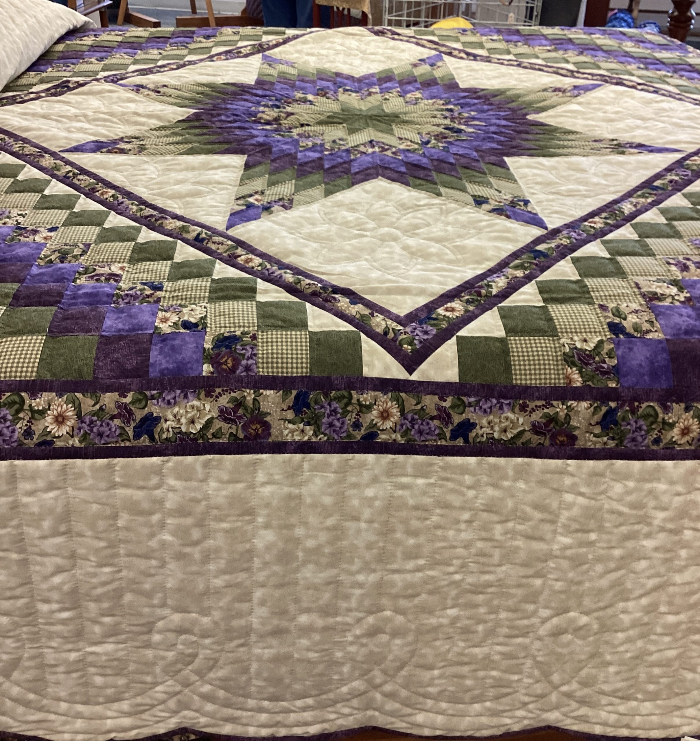 A beautiful center star surrounded by smaller squares and a fabric border. With tiny hand stitching and meticulous piecing, done in beautiful shades of purple , green and cream in solid as well as printed fabrics as well.