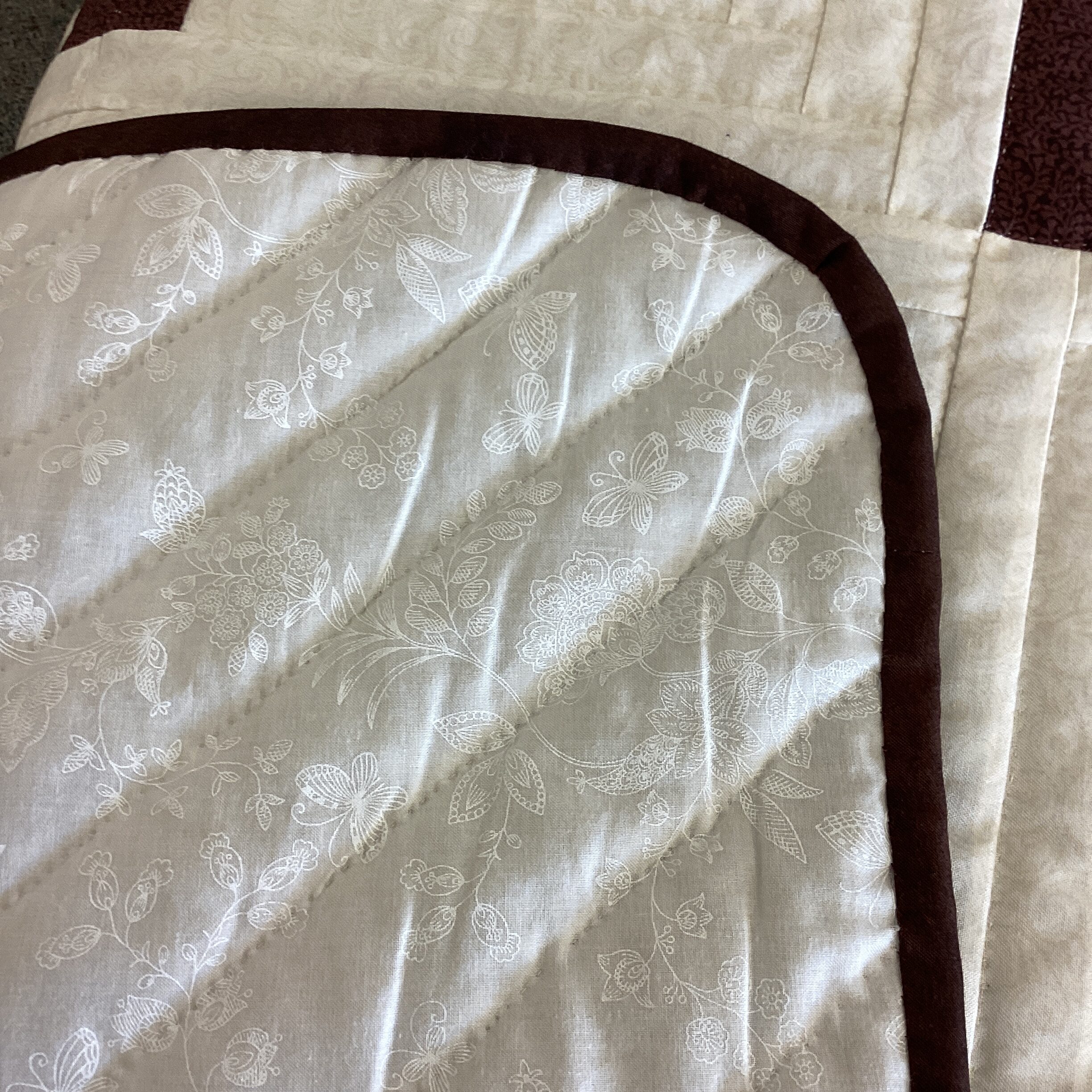 The beautiful quilt features the traditional Log Cabin pattern as well as the Bear Claw pattern in browns, greens and creams The diamond shapes in the center show off the the bear claw pattern as well. The border is brown and the backing is cream with printed butterflies and flowers in white print.