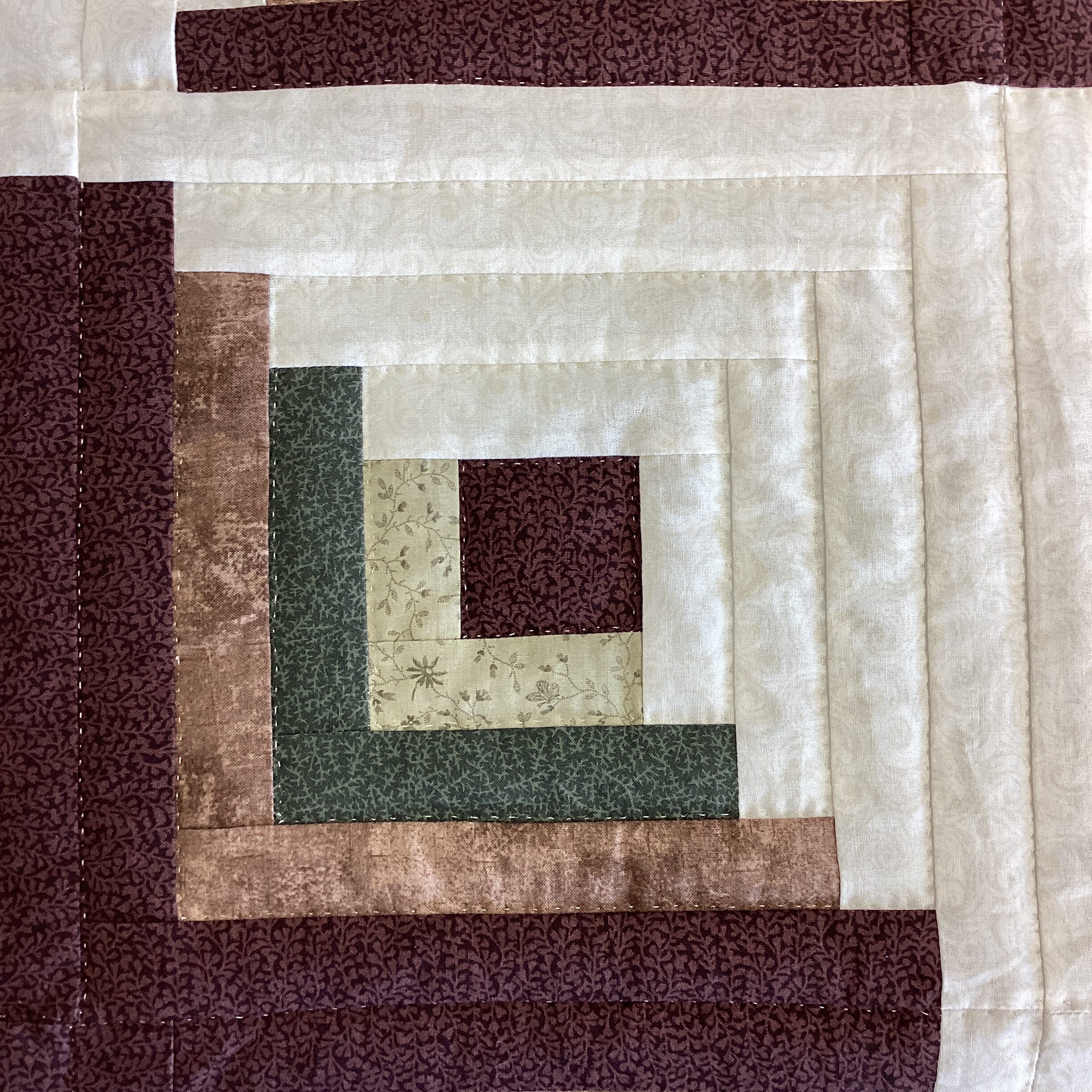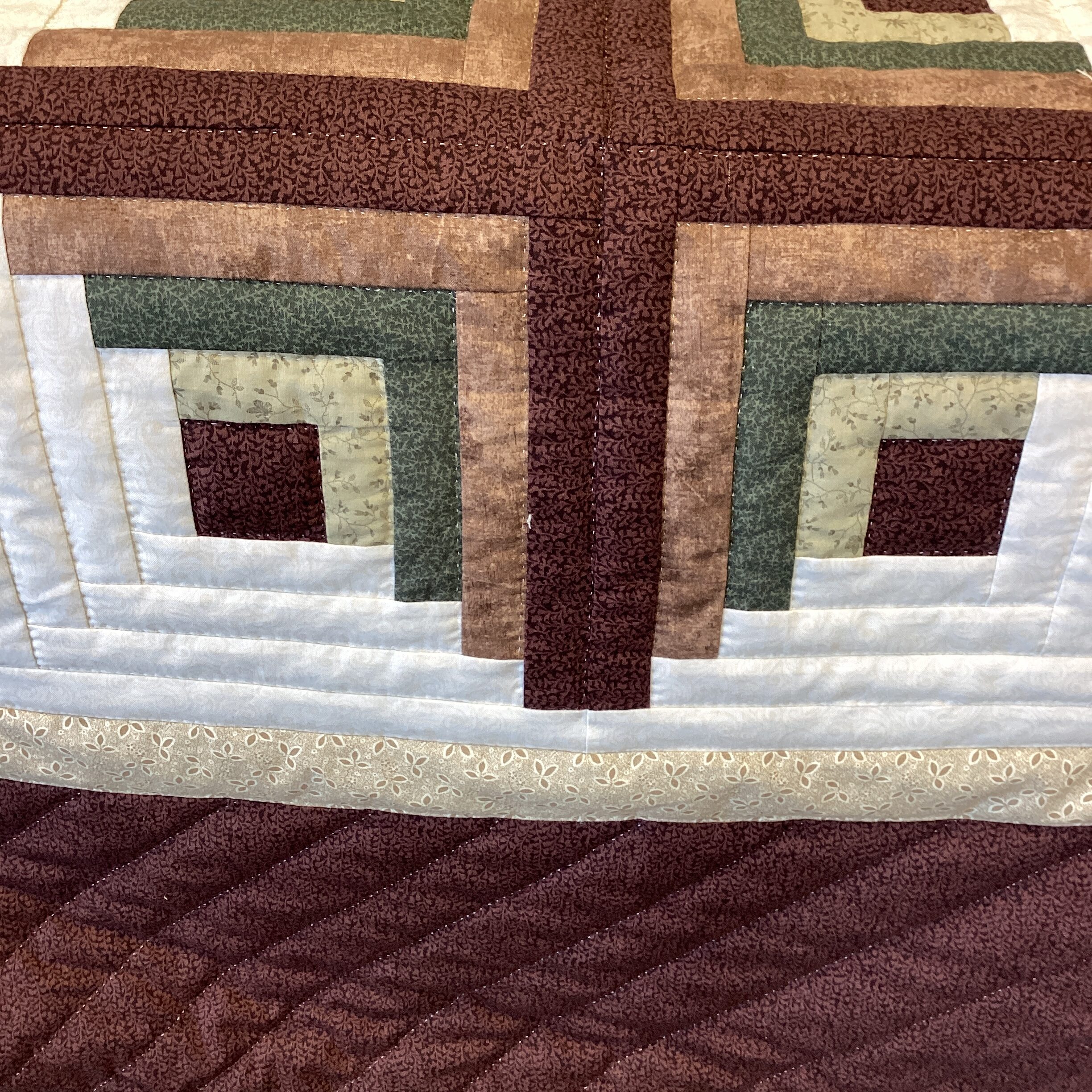A traditional log cabin in greens, creams, and browns. The center features a bear claw pattern , the border is a dark brown.