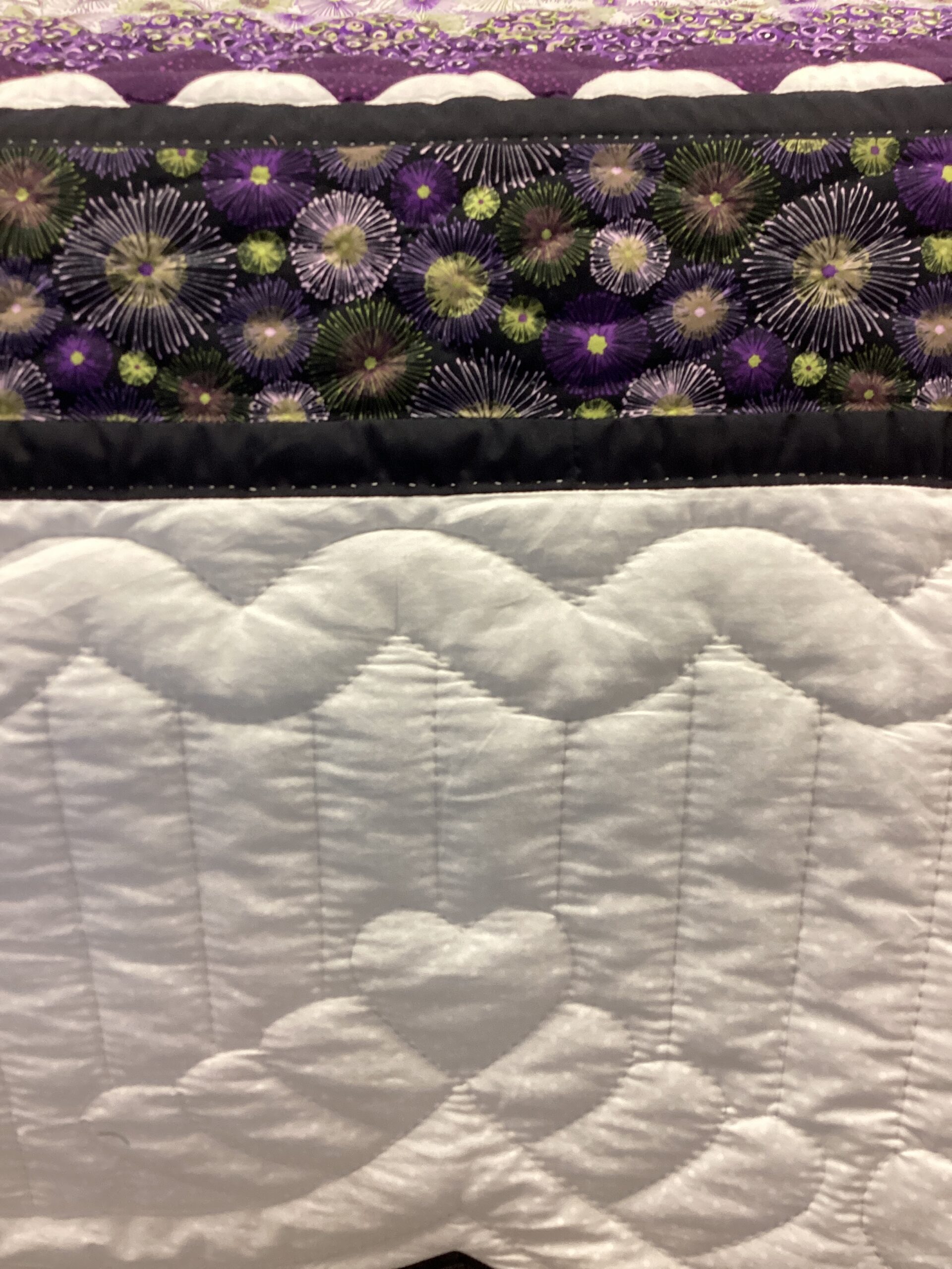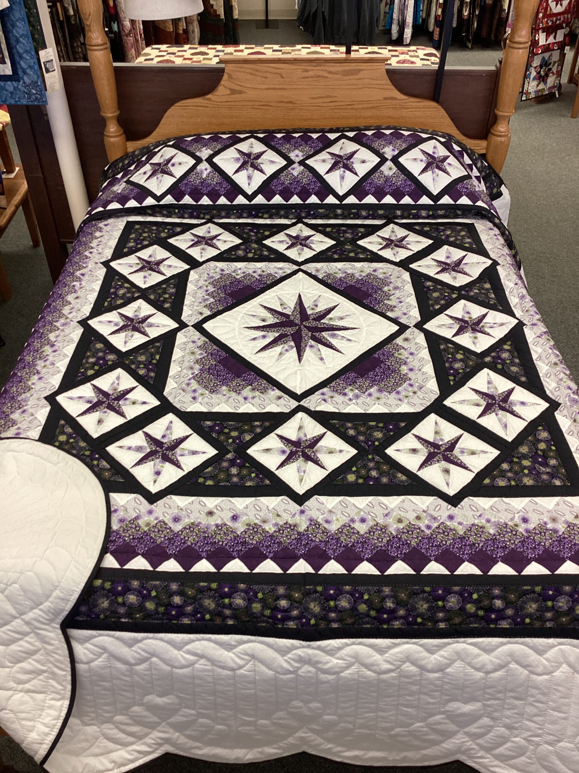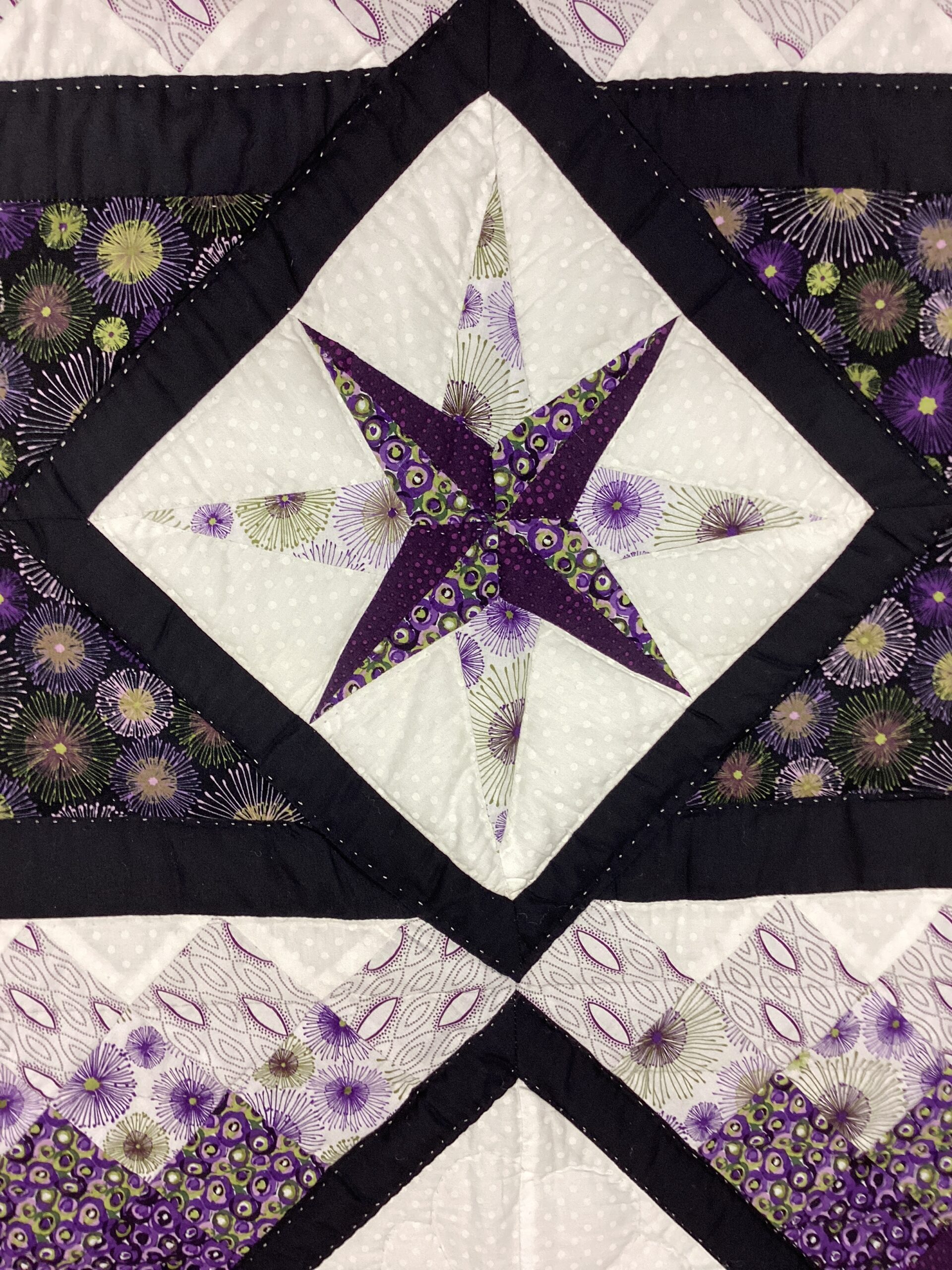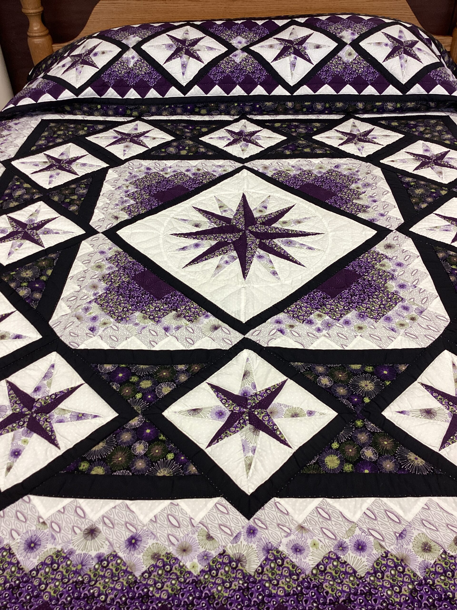 In the middle of this beautiful quilt there is star in deep purple, surrounded by a diamond in black fabric that frames this beautiful medallion. What an awesome focal point!. each corner has 2 star boxed but also there are singles that dance around the center. There are also beautiful printed floral fabric squares from light to dark thru the whole quilt. No need to shams! the pattern continues along to the top of the pillow placement.