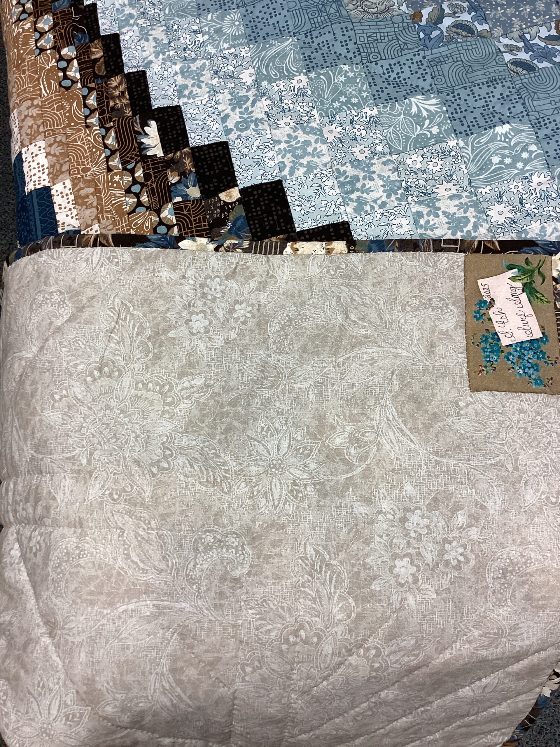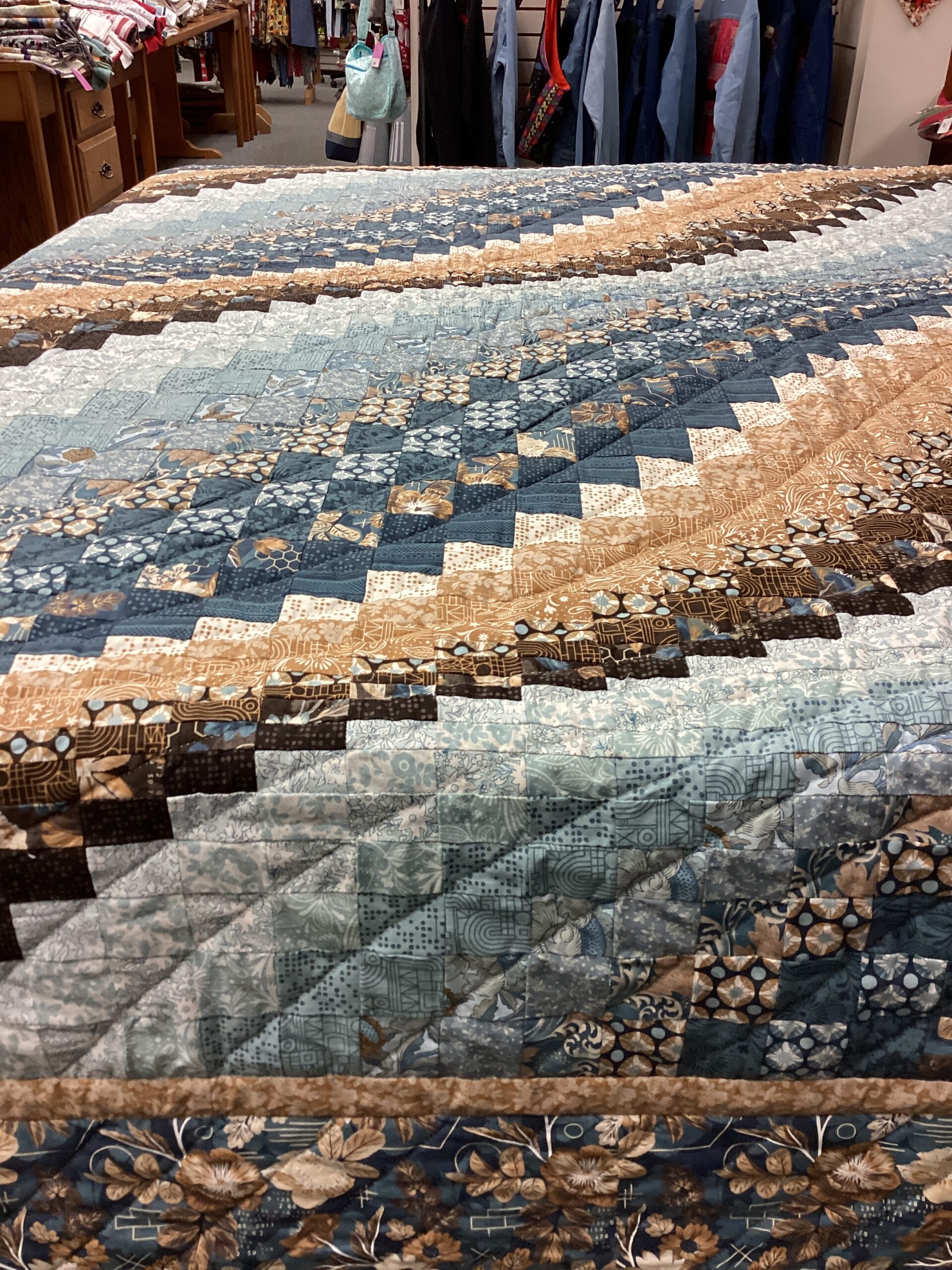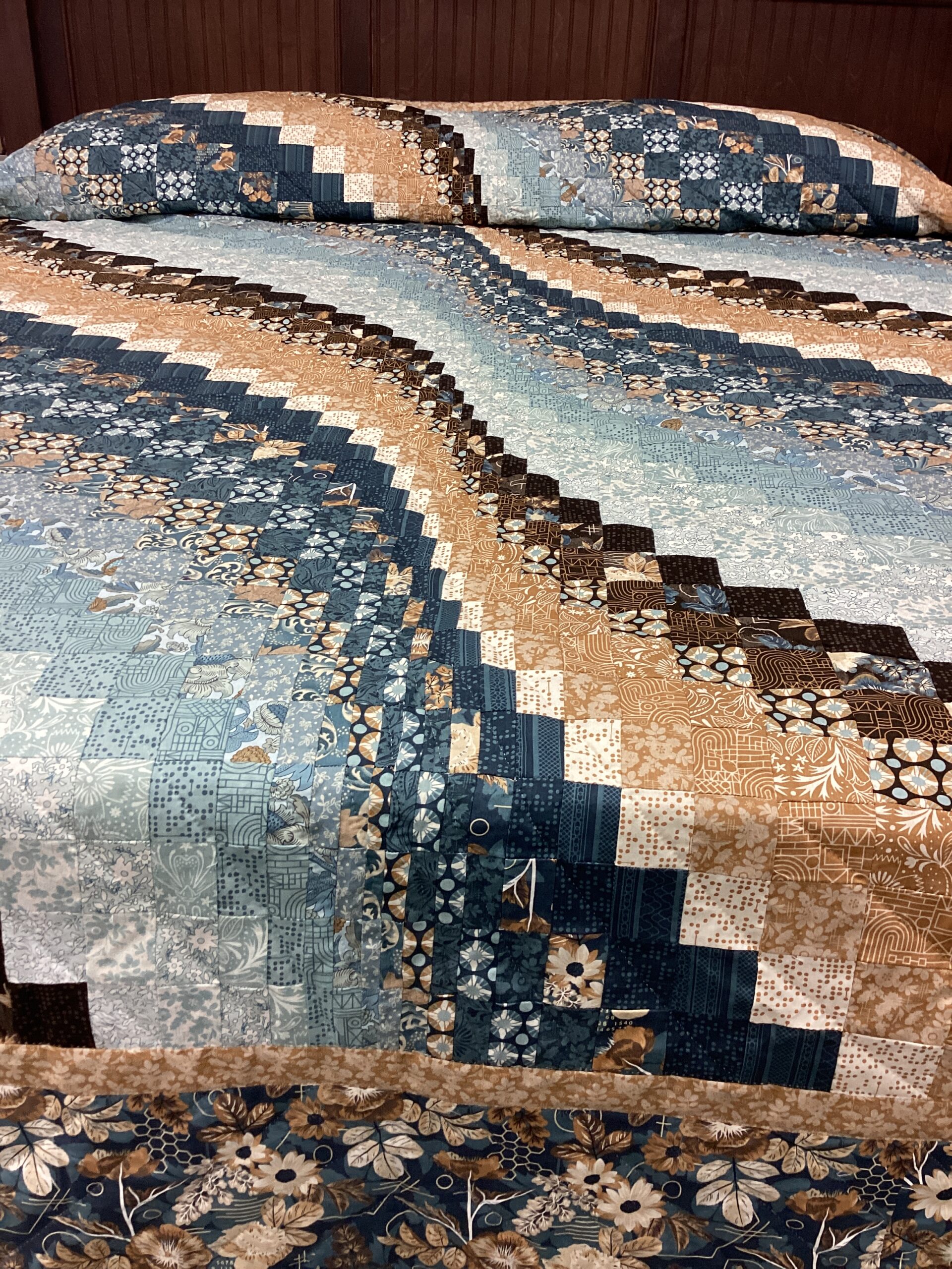 This is type of Bargello pattern in completed with brown and tan rectangles as well as squares that form a movement pattern within the quilt. The border is done in a slate blue flowered fabric .