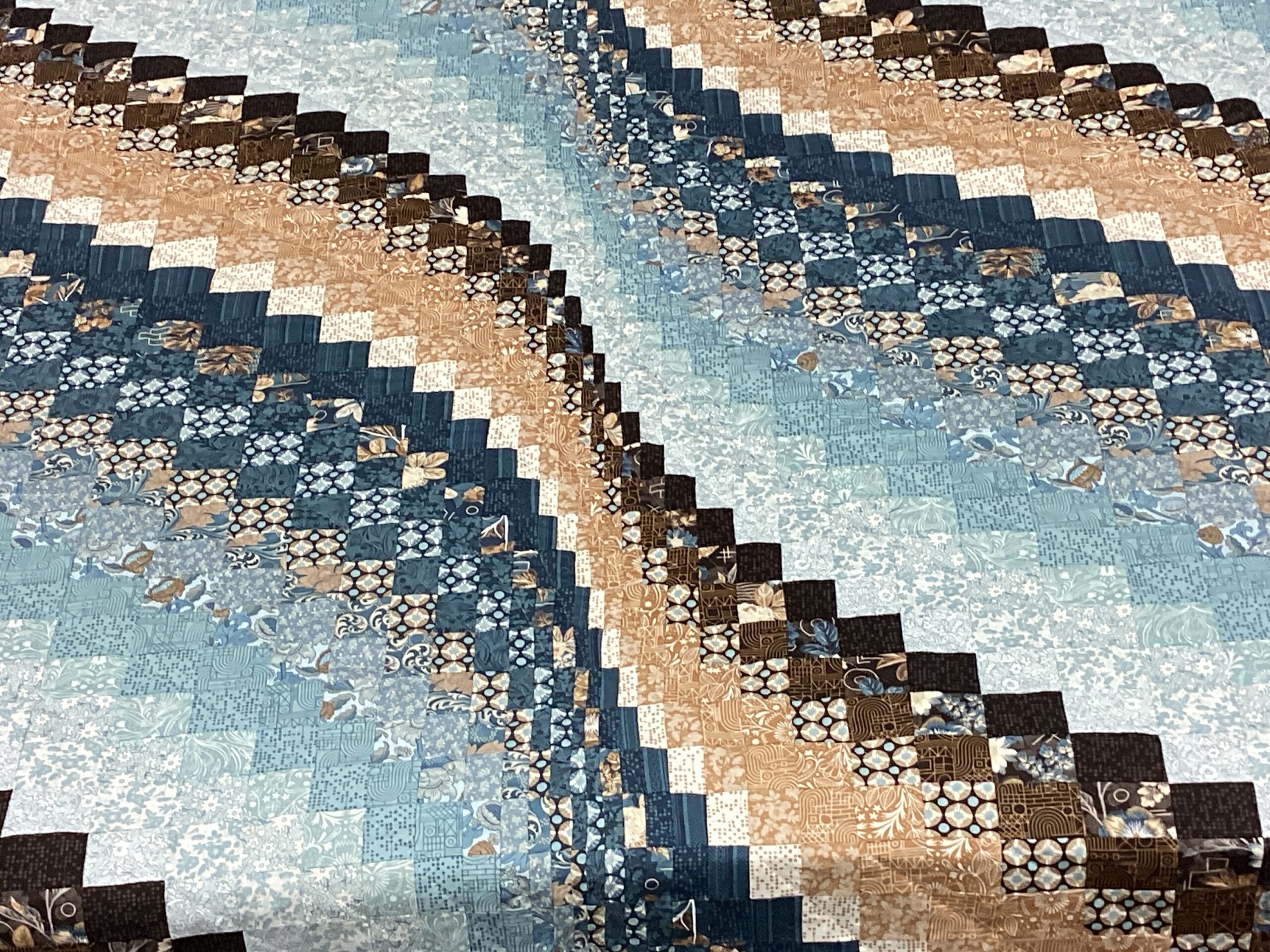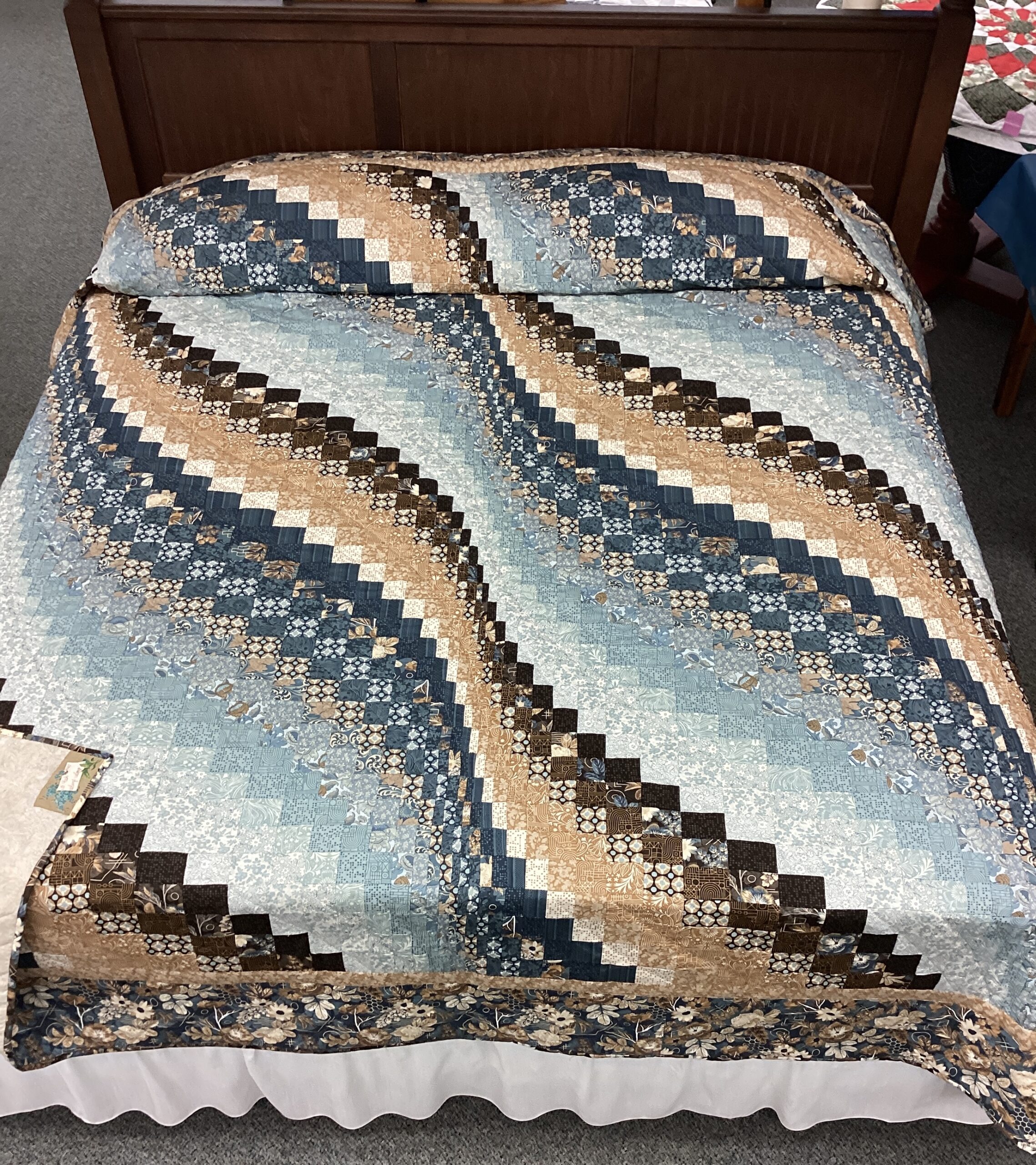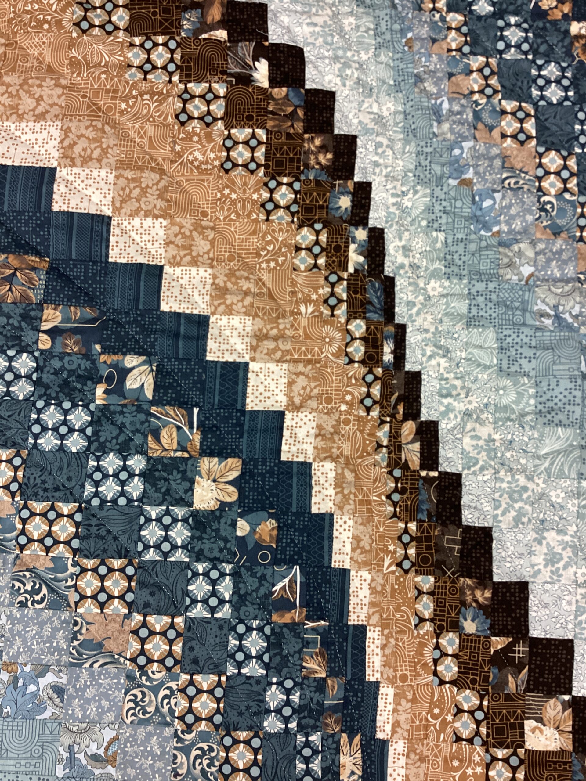 This is type of Bargello pattern in completed with brown and tan rectangles as well as squares that form a movement pattern within the quilt. The border is done in a slate blue flowered fabric .