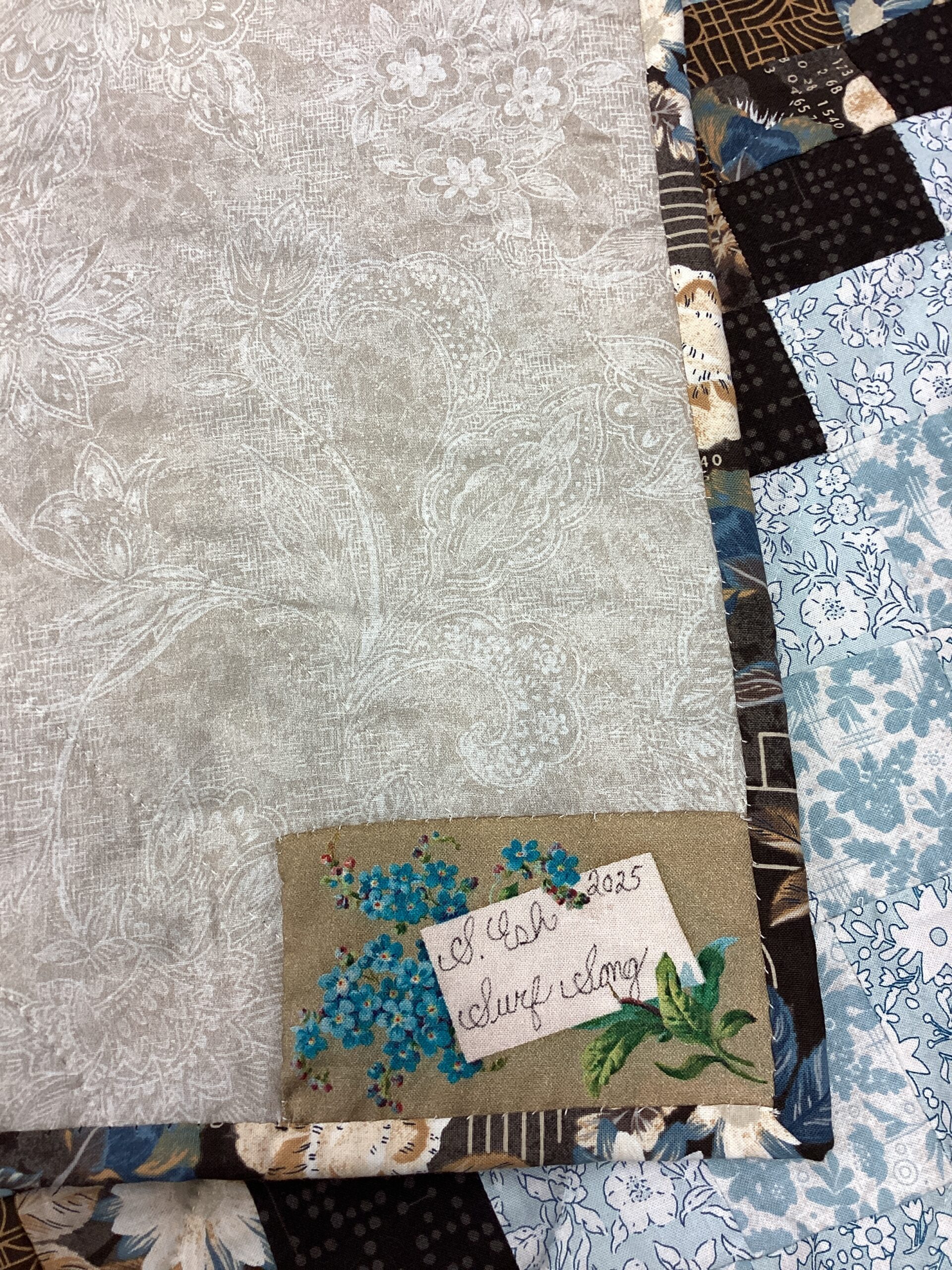 - This stunning Bargello quilt showcases a striking design of squares and rectangles that gradually shift in size, forming smooth curves that culminate in elegant points. This particular arrangement is called a surf song . The quilt’s color palette is a harmonious blend of blue, shades of browns, and creams, making it an eye-catching centerpiece. The quilt is framed by a slate blue color adorned with tan and brown flowers. On the reverse side, you’ll find a lovely white-on-cream floral print, adding versatility and making the quilt fully reversible.