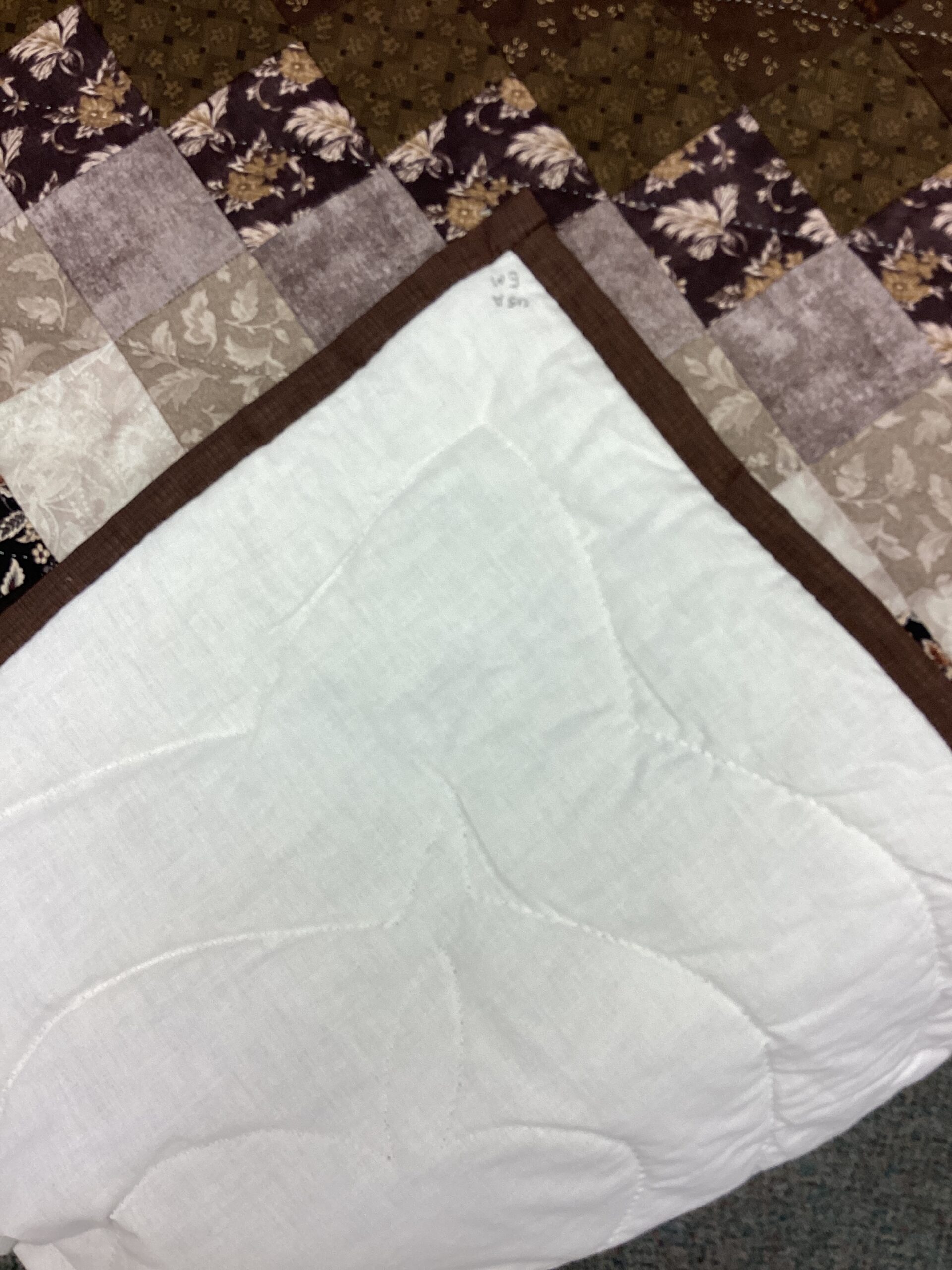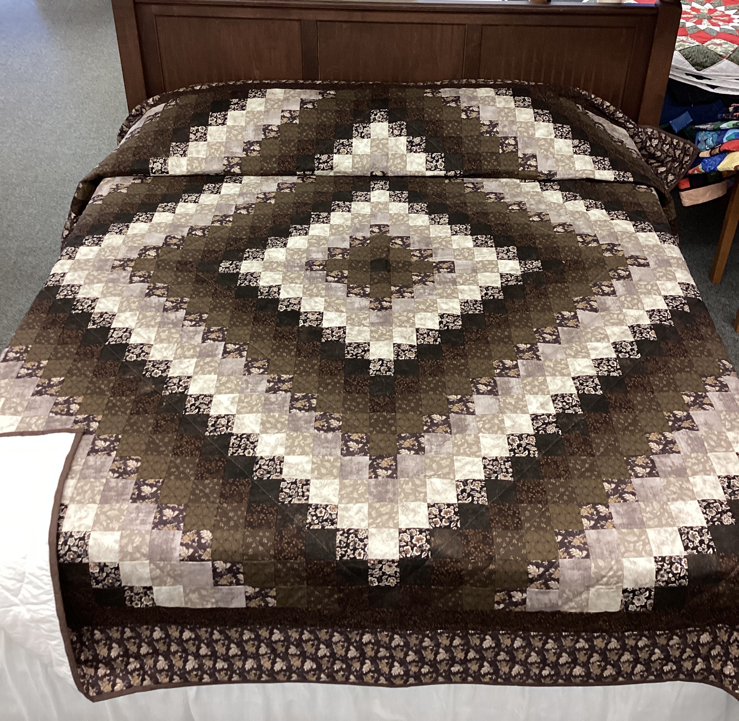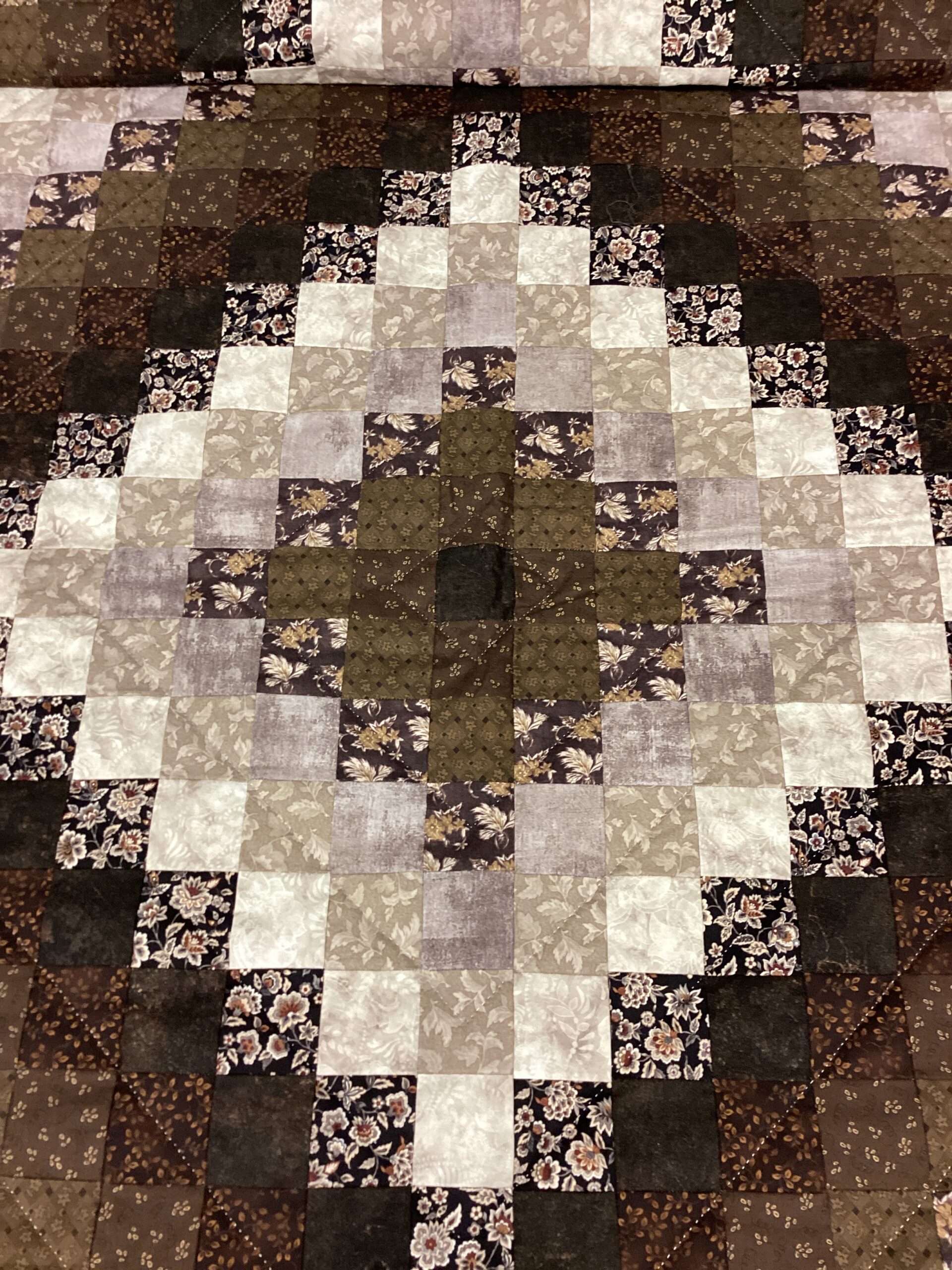 Trip around the World pattern in various shades of browns and creams . The border completes this quilt in a dark chocolate calico print. . The backing is a cream colored which showcases the hand quilting.